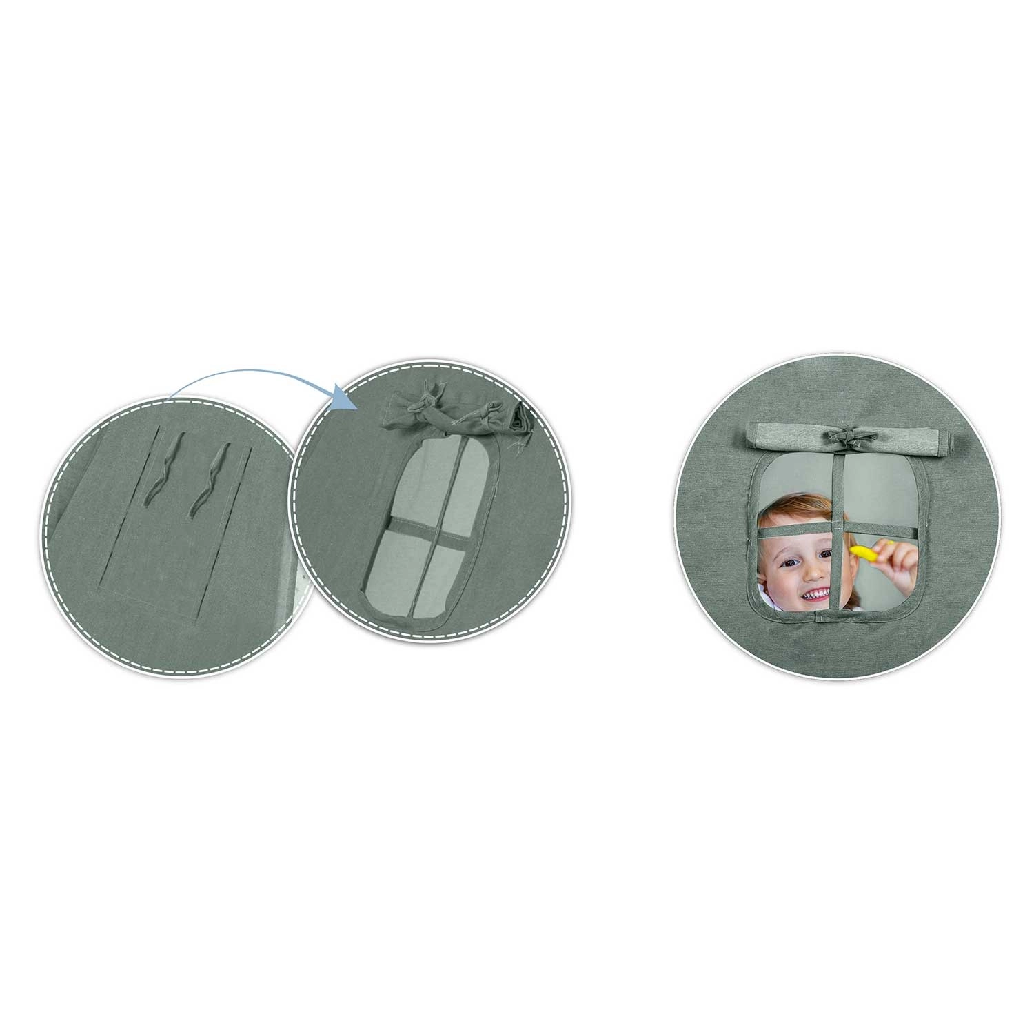 Prozor s roletom i vezicama omogućuje provjetravanje, igru skrivača i pogled van. Vrata s zavjesama lako se zavežu za udoban ulaz.
