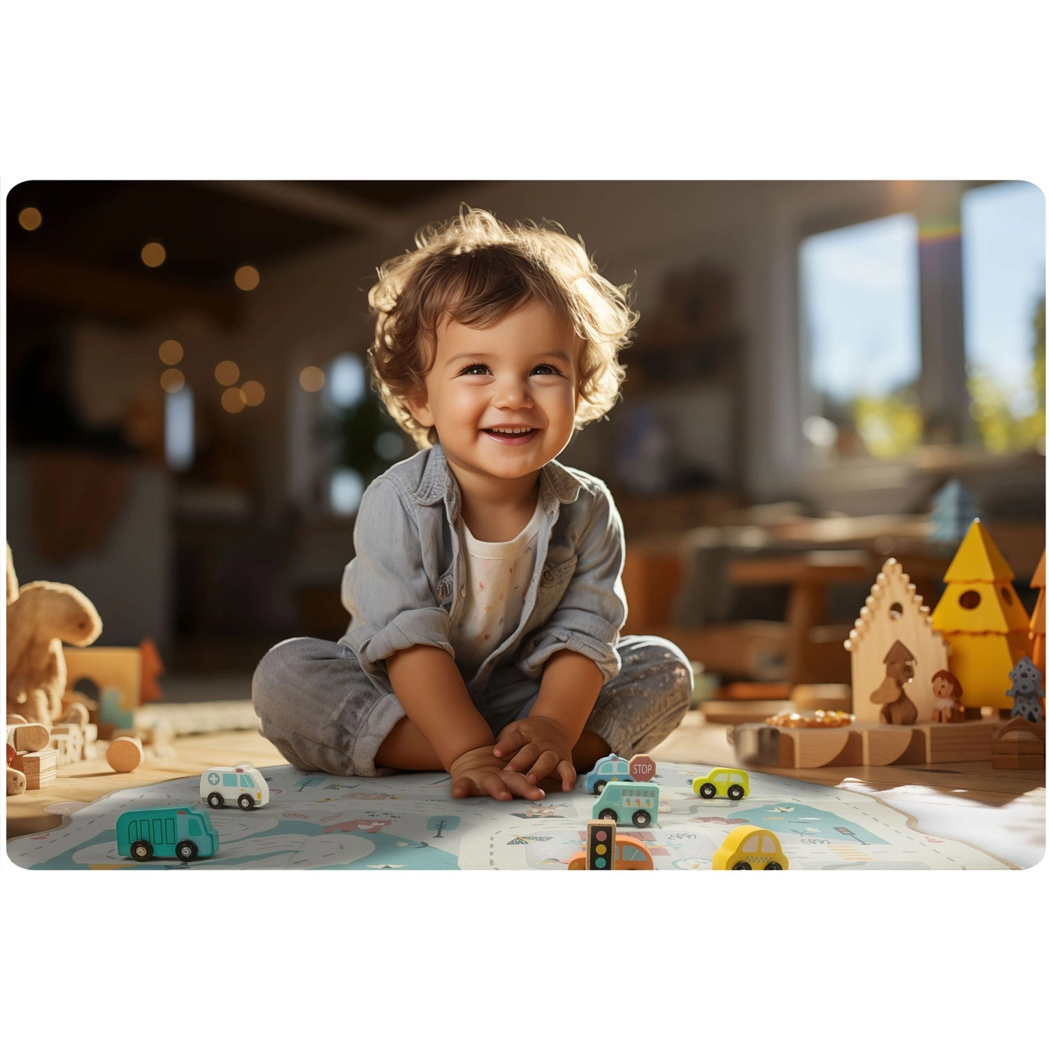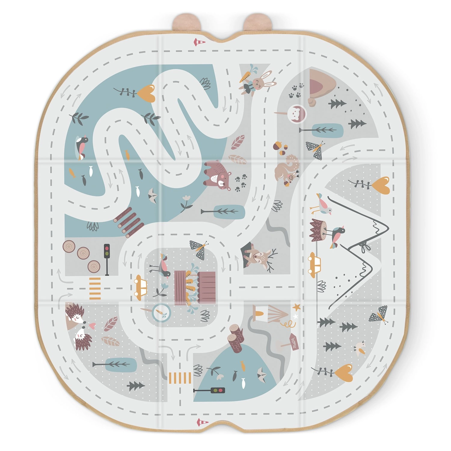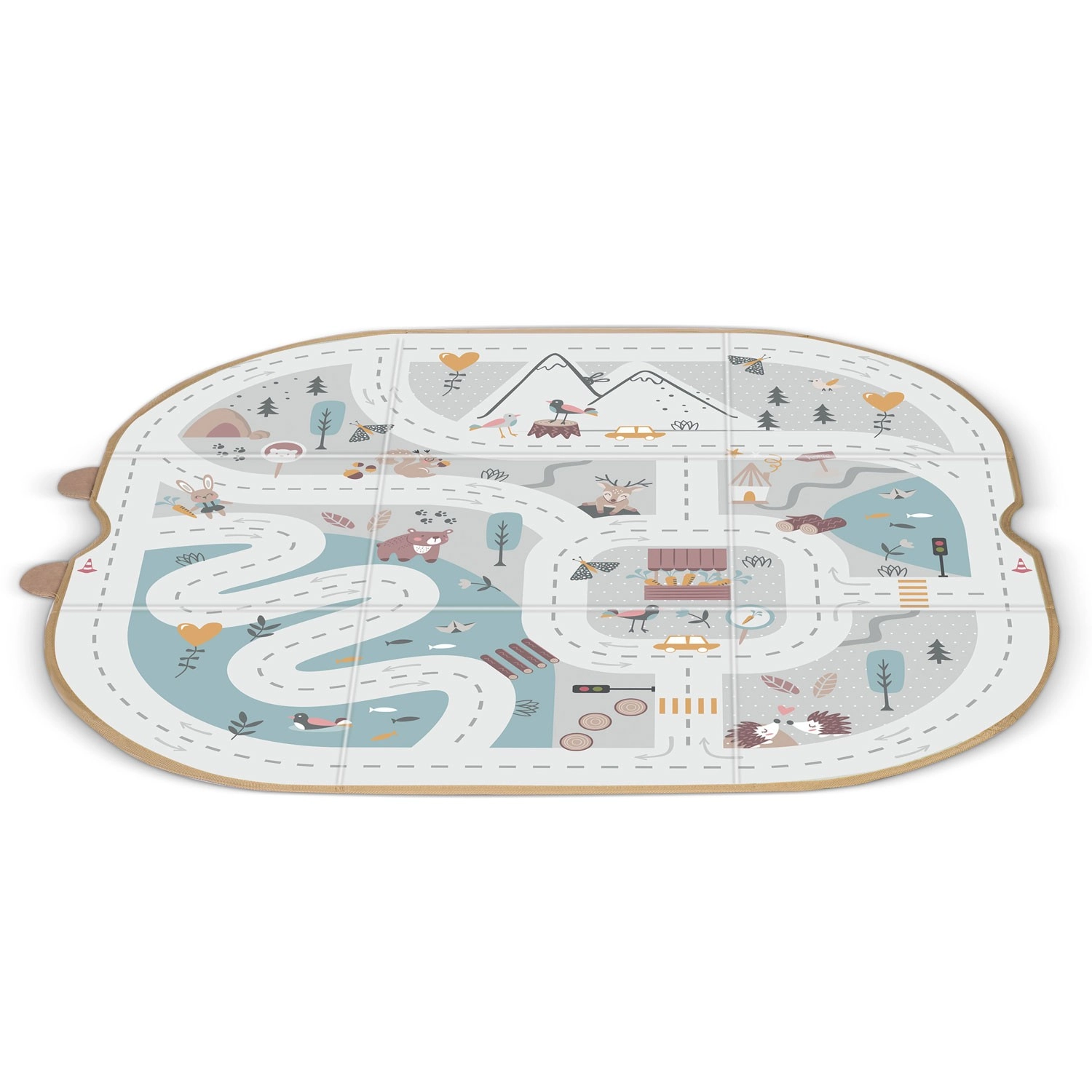 Mekani paneli s tiskom cesta, planina i životinja potiču kreativnu igru s autićima i figuricama te pružaju ugodnu podlogu.