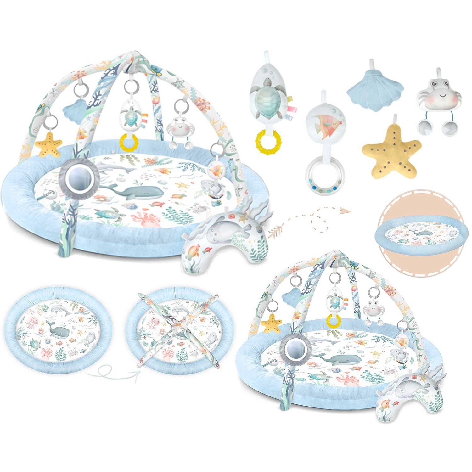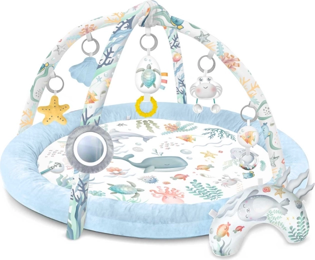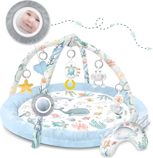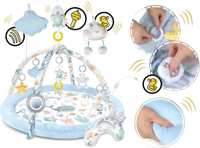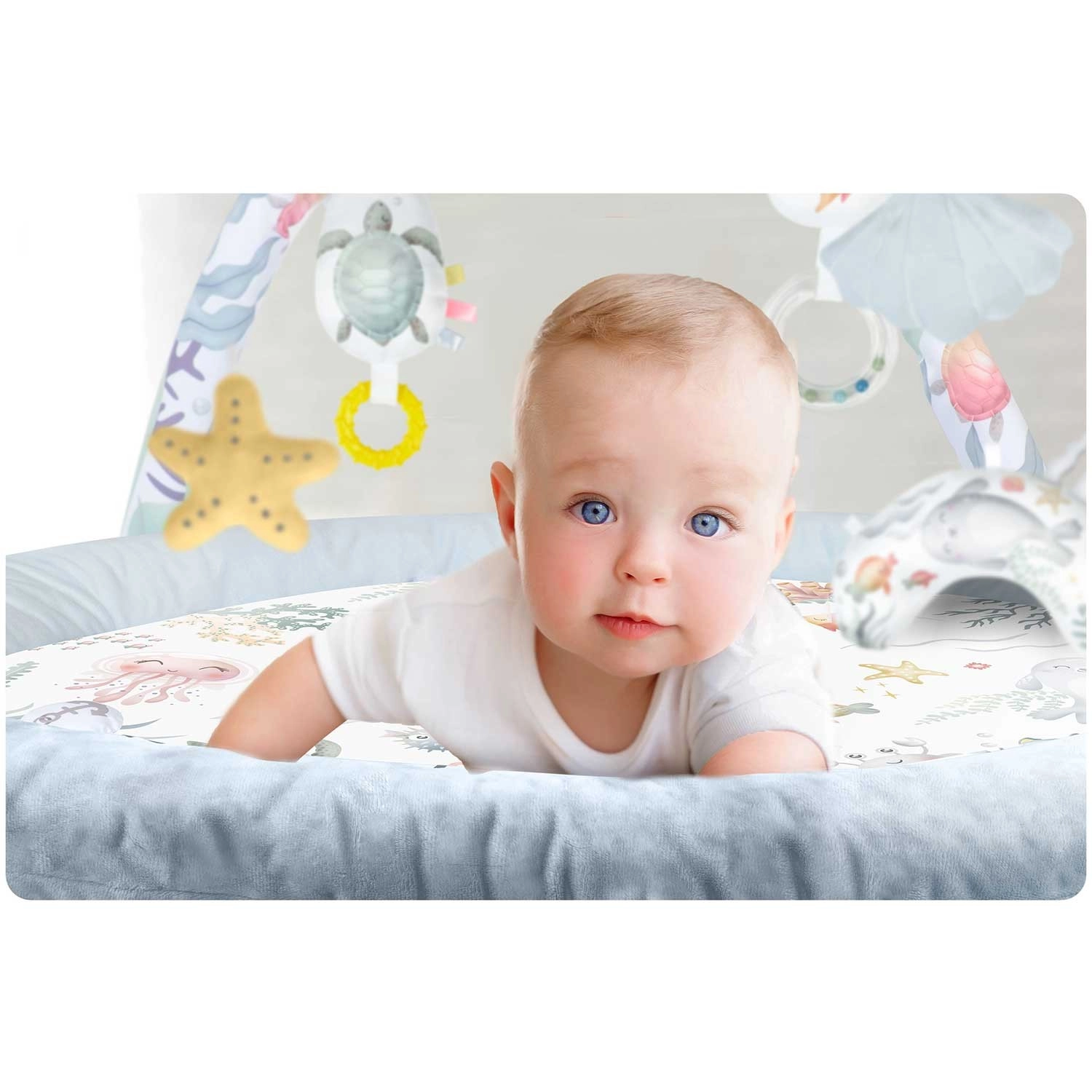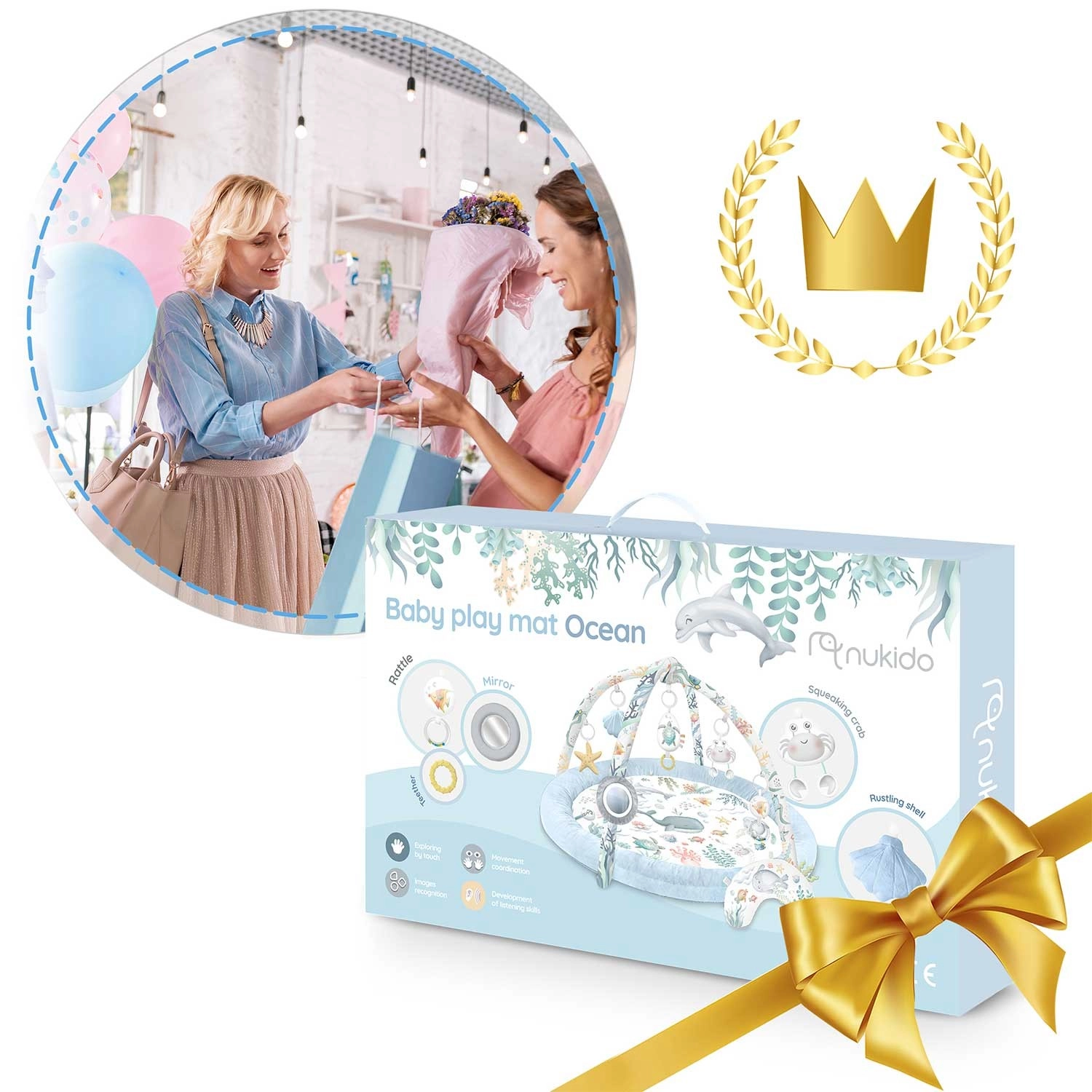 Podloga za igru Nukido Ocean stvara ugodno i sigurno okruženje za novorođenčad i veće bebe. Dva ukrštena luka nose odvojive igračke koje razvijaju vid, dodir i sluh – od zrcalca za samoprepoznavanje preko zvečkica do šuškavih elemenata i piskavog raka. U kompletu je i mekani jastučić za udobnu igru na trbuhu.