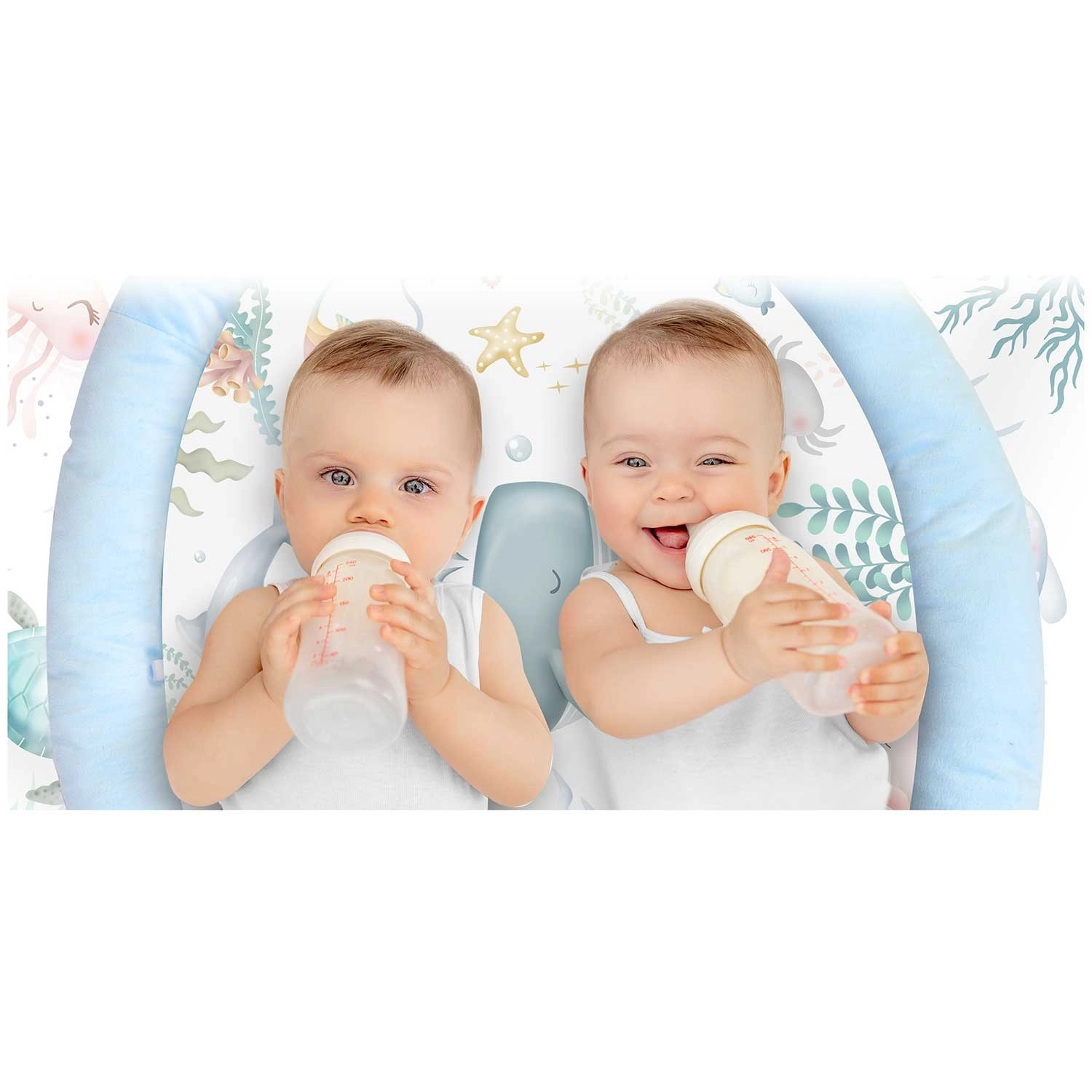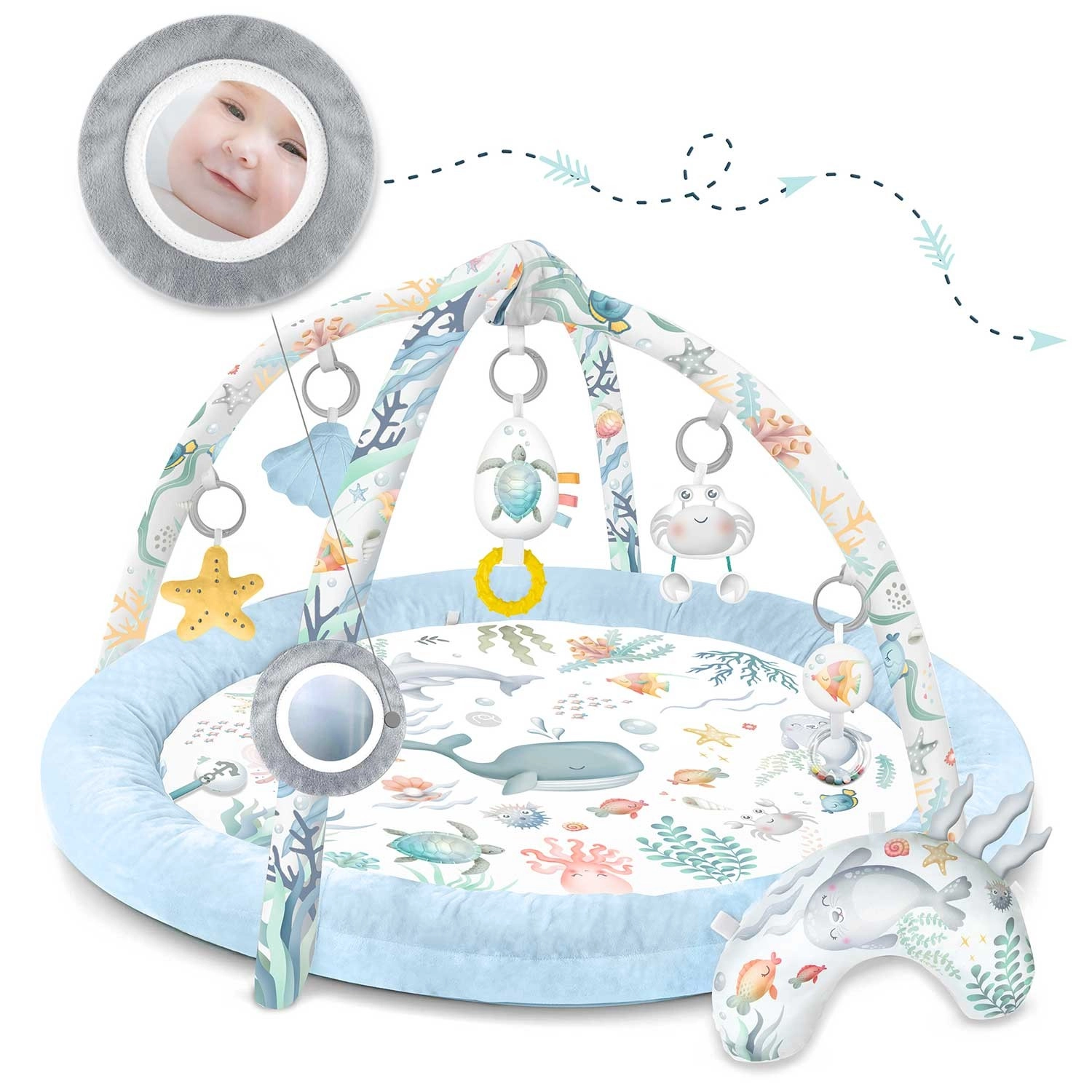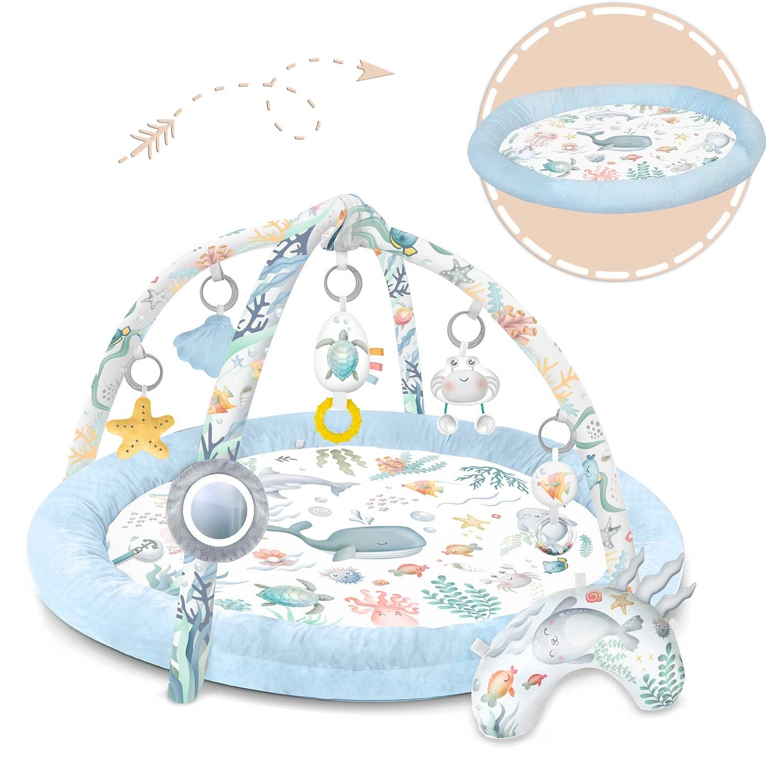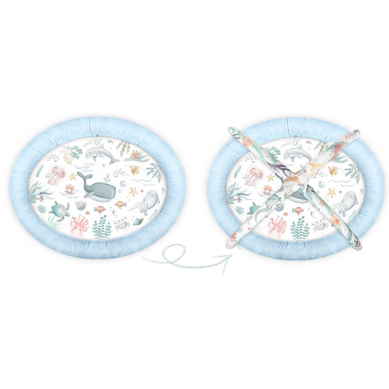 Podloga za igru Nukido Ocean stvara ugodno i sigurno okruženje za novorođenčad i veće bebe. Dva ukrštena luka nose odvojive igračke koje razvijaju vid, dodir i sluh – od zrcalca za samoprepoznavanje preko zvečkica do šuškavih elemenata i piskavog raka. U kompletu je i mekani jastučić za udobnu igru na trbuhu.