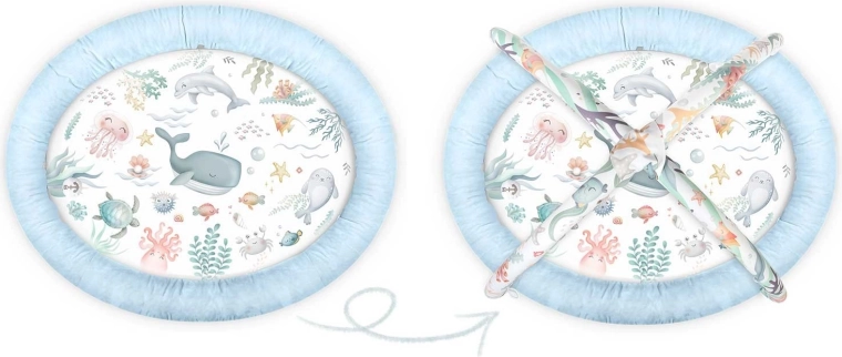 Podloga ima lako perivu i ugodno mekšu površinu s dobro izolirajućim dnom. Zahvaljujući brzom sklapanju lako se prenosi ili sprema, a odvojivi lukovi produžuju vrijeme korištenja – iz kokona za novorođenče pretvara se u prostranu mekanu podlogu za malo dijete.