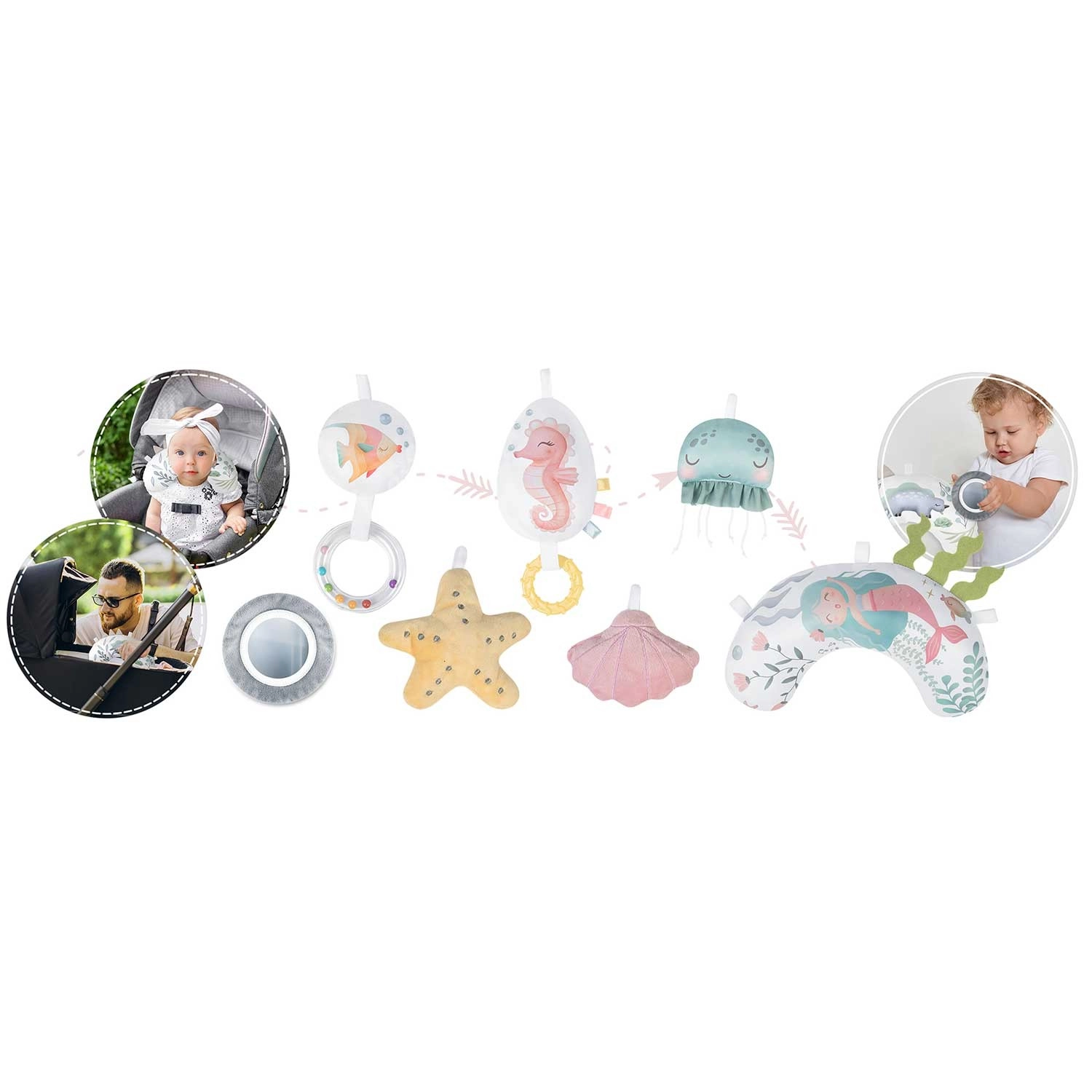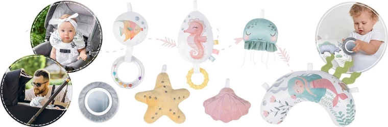 Ogledalce, zvjezdica, školjke, meduza, morski konjić i drugi elementi sa zvečkajućim i šuškajućim efektima potiču znatiželju, koordinaciju oko–ruka i prve hvatove.