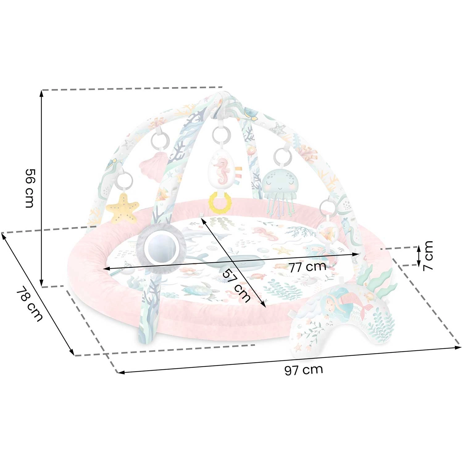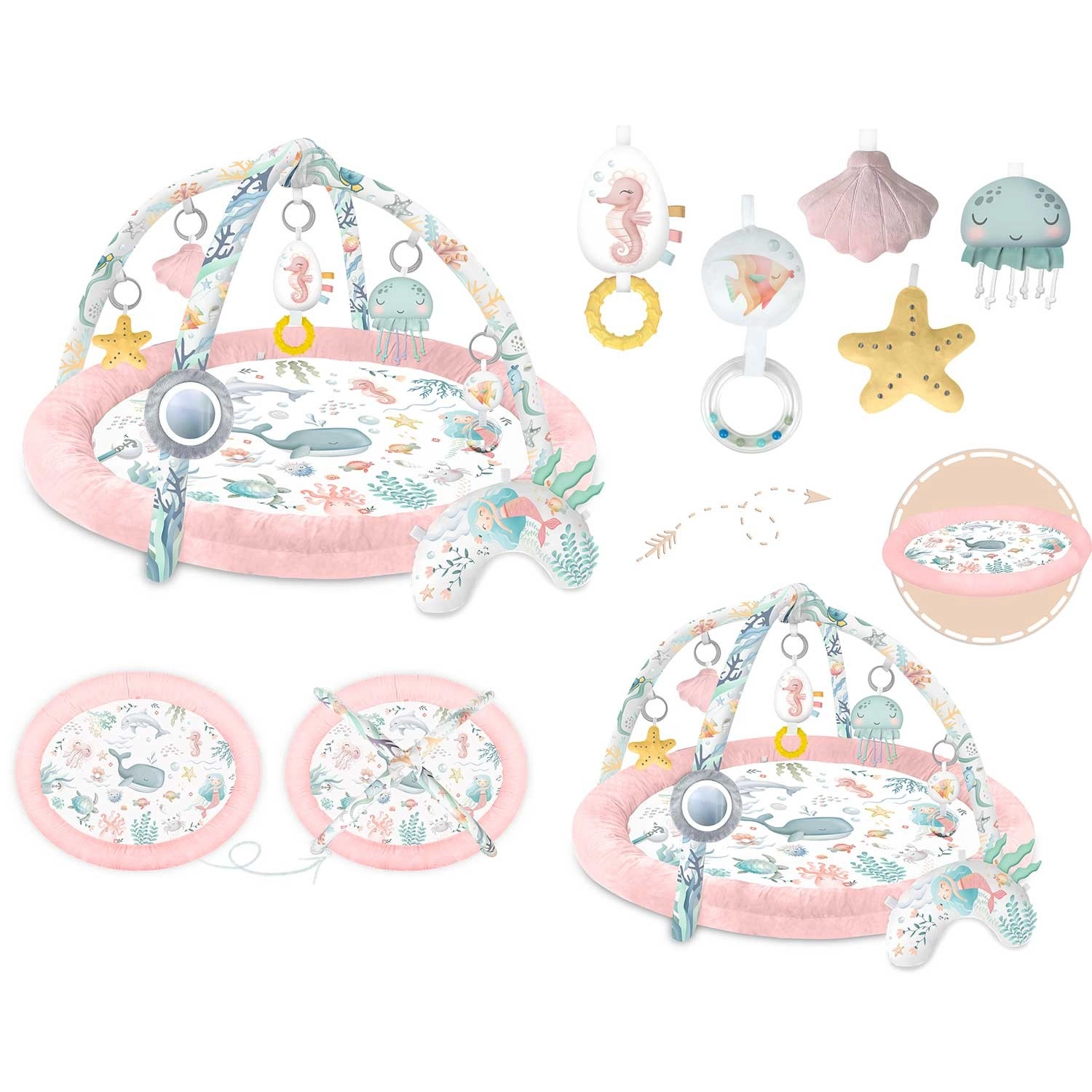 Igraću podlogu, ugrađeni obrub/gnijezdo, 2 odvojiva luka, 7 multifunkcionalnih igračaka