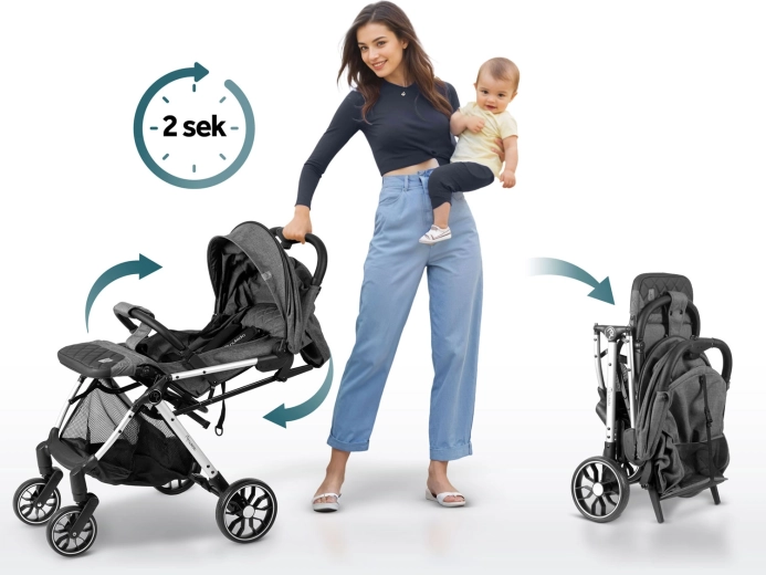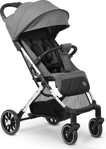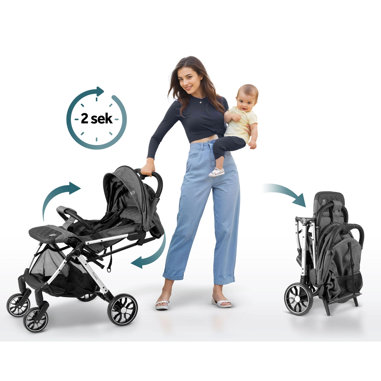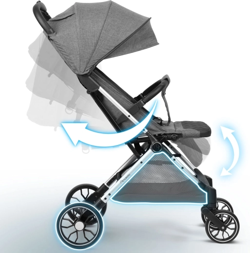 Krošnja s višestupanjskim podešavanjem pruža zaštitu od sunca, vjetra i lagane kiše, dok se pojas u 5 točaka s podstavom i uklonjiva zaštitna prečka brinu za sigurnost i udobnost. Naslon podesiv do ležećeg položaja i podesiv oslonac za noge omogućuju djeci odmor i san tijekom duljih šetnji. Održavanje olakšava PU eko koža na osloncu za noge, otporna na vlagu i mrlje.