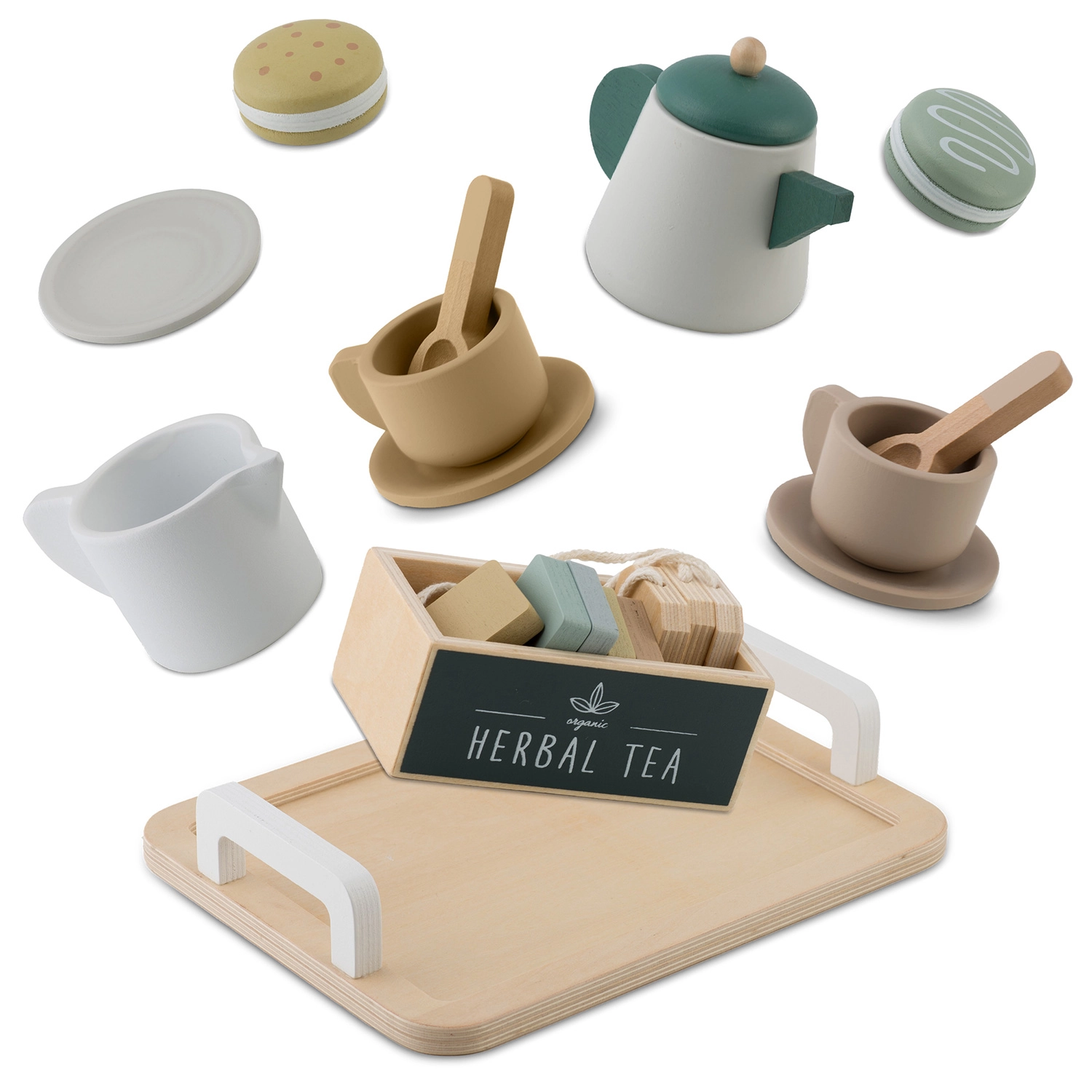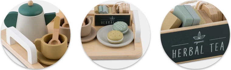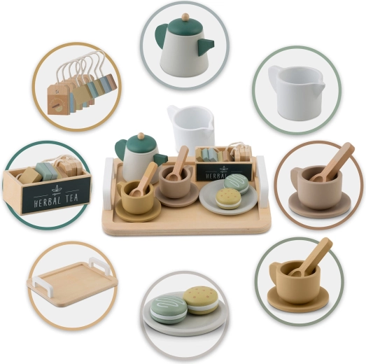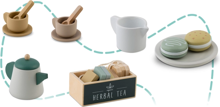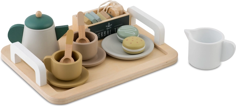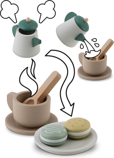 Ovaj drveni čajni set NUKIDO donosi djeci realističnu igru posluživanja čaja – od točenja iz čajnika preko miješanja žličicom do posluživanja makarona na pladnju. Zahvaljujući glatkim rubovima, čvrstoj konstrukciji i certificiranim bojama, igra je ne samo zabavna, nego i sigurna.