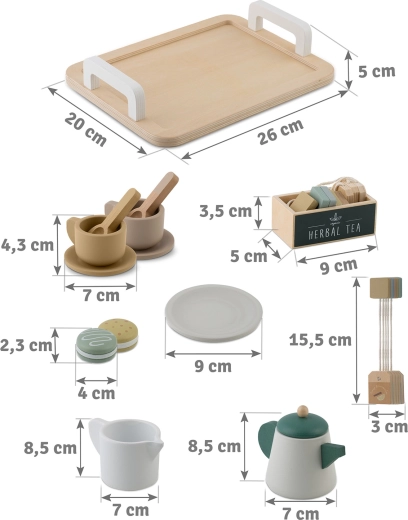 - Bogata oprema: čajnik s poklopcem, 2 šalice s tanjurićima i žličicama, vrč za mlijeko, tanjurić s makaronima, kutijica za čajeve, 5 vrećica čaja i poslužavni pladanj s ručkama.