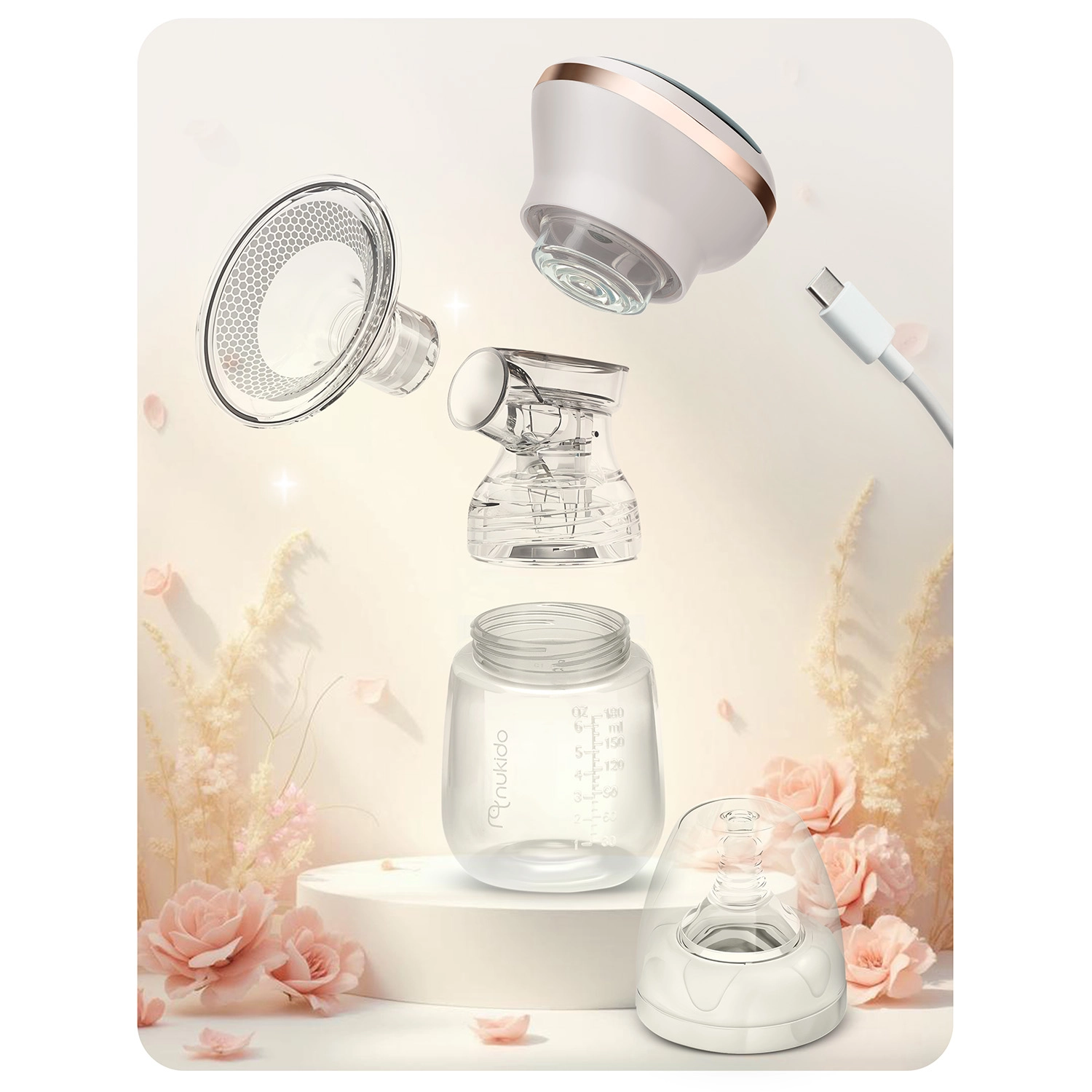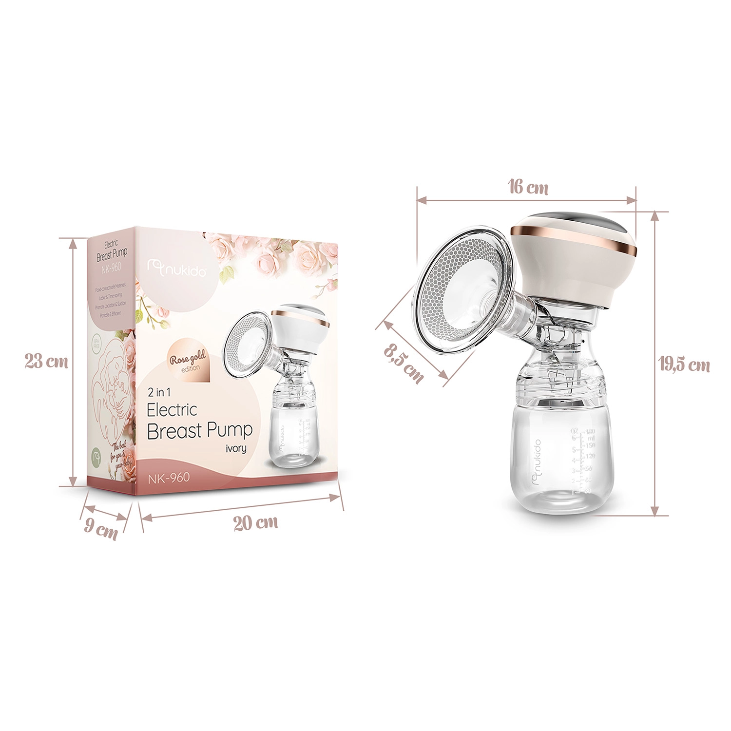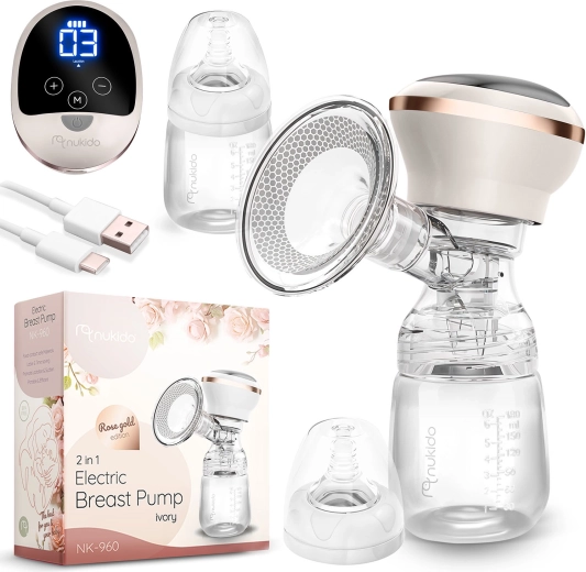 Kompaktna i tiha električna izdajalica majčinog mlijeka Nukido nudi 3 faze izvlačenja, do 9 razina stimulacije, LED zaslon s dodirom i bežično korištenje zahvaljujući integriranoj litij bateriji. U kompletu je bočica 180 ml s dinamičnom dudom, mekani silikonski masažni umetak za udobnost i USB‑C punjenje. Materijali su bez BPA, a dijelove (osim električnog panela) moguće je prati u perilici posuđa.
