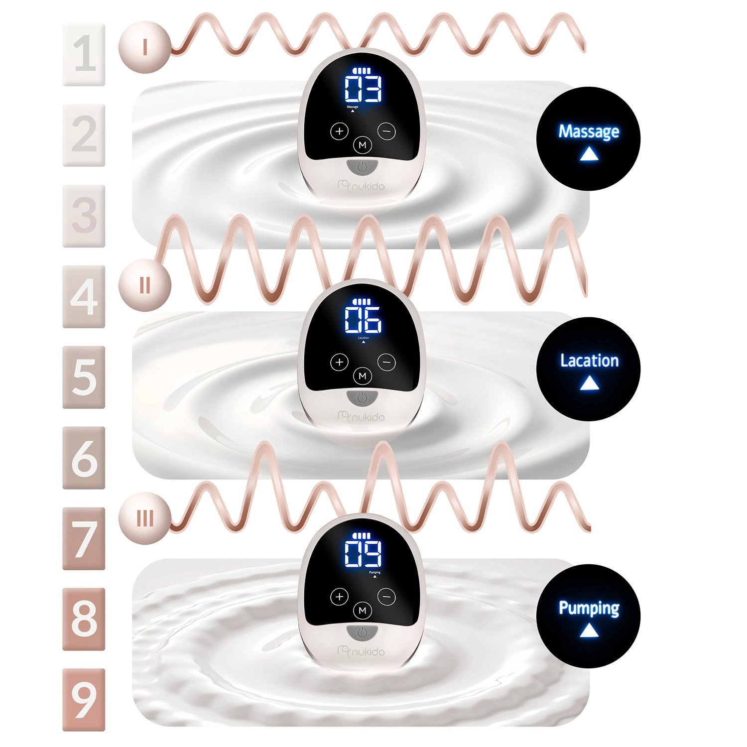 Izdajalica Nukido vjerno oponaša prirodni ritam sisanja bebe za učinkovito i nježno izdajanje mlijeka. Tri režima (stimulacija, sisanje, duboko izdajanje) i 9 podesivih razina omogućuju prilagodbu učinka vašim potrebama bez boli. Masažni silikonski umetak s nježnim dodirom potiče refleks otpuštanja i povećava udobnost i pri duljoj uporabi.