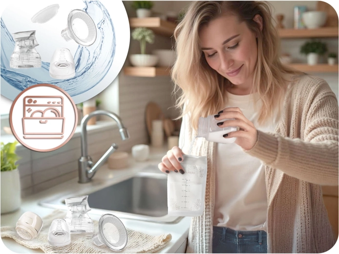 Dio je i bočica 180 ml s dinamičnom dudom koja oblikom podsjeća na majčinu dojku i podupire ispravnu tehniku sisanja kako se ne bi narušila laktacija. Većinu dijelova moguće je prati u perilici posuđa (osim električnog panela), a korišteni materijali su antibakterijski i bez BPA. Kompaktne dimenzije i tih rad čine ovu izdajalicu idealnim izborom za dom, posao i putovanja.