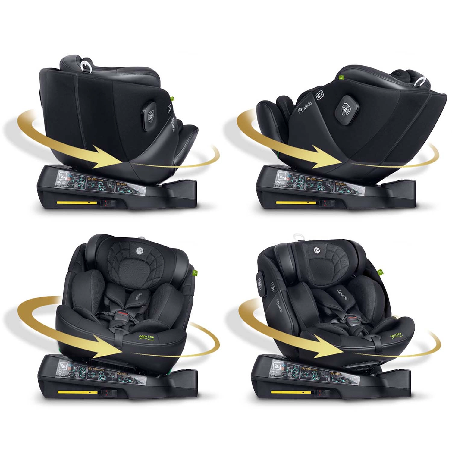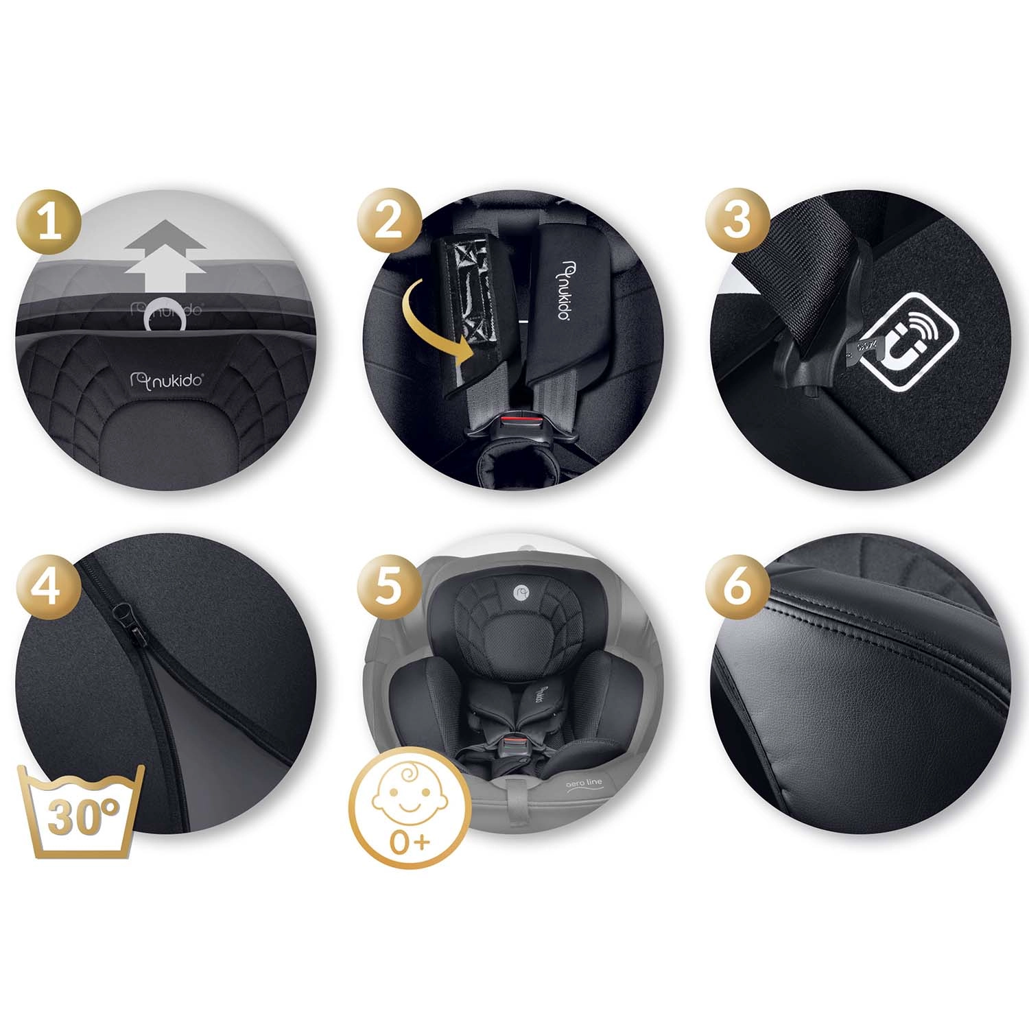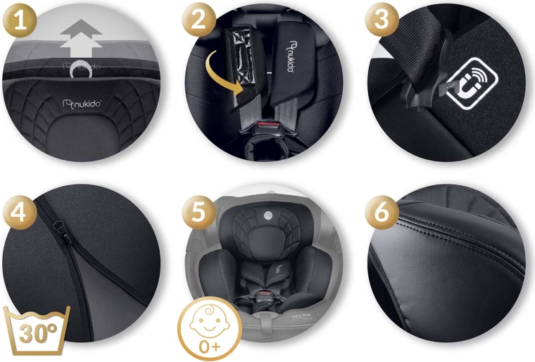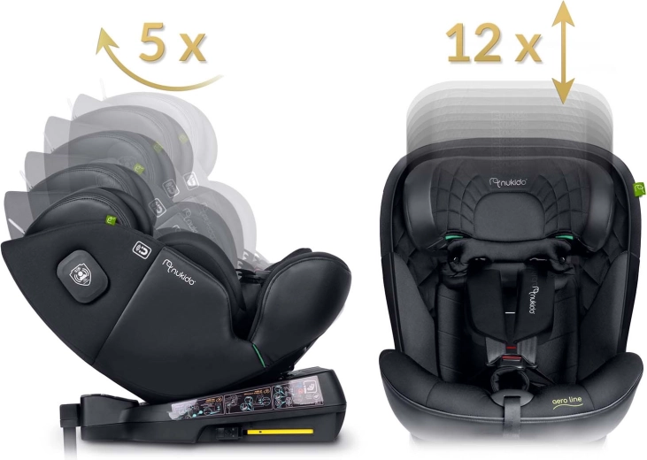 NUKIDO Aero Line je premium autosjedalica koja kombinira najviše sigurnosne standarde i-Size s dugotrajnim komforom od rođenja do približno 12 godina. Zahvaljujući rotacijskom sustavu 360° lako pričvrstite dijete sa strane i odaberete smjer vožnje RWF/FWF prema dobi i visini. Mekana prošivena presvlaka, ergonomsko oblikovanje i umetci za novorođenče osiguravaju udobnost i na dugim putovanjima.