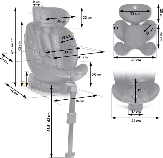 Napredni SIP – Side Impact Protection s bočnim apsorberima energije, potporni nogar i čvrste ISOFIX kopče pružaju stabilnost i zaštitu pri udaru. Naslon za glavu s 12 položaja raste s djetetom, 5 položaja nagiba povećava udobnost spavanja, a pojasevi u 5 točaka s protukliznim navlakama pouzdano ostaju na mjestu. Odvojiva presvlaka periva je za jednostavno održavanje.