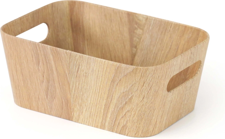 Praktičan i stilski spremnik/koš u prirodnoj boji drveta savršeno se uklapa u svako kućanstvo. Nudi kompaktne dimenzije 26 × 18 × 11 cm, lagan je i izdržljiv zahvaljujući kombinaciji papira i kartona. Idealan za organizaciju sitnica u kupaonici, spavaćoj sobi, dječjoj sobi i radnom prostoru.