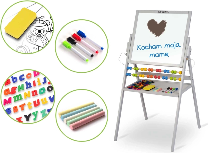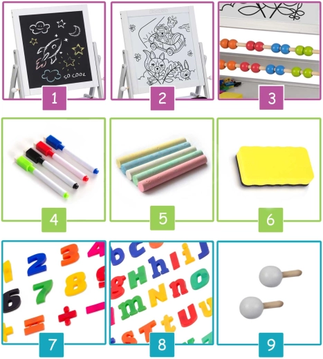 Zahvaljujući bogatoj opremi djeca odmah počinju stvarati: šarene krede, suhosbrisivi markeri, spužvica, magnetna slovca i brojke te montažni elementi. Sigurni materijali i stabilna konstrukcija od prirodnog drva donose mir roditeljima i radost djeci.