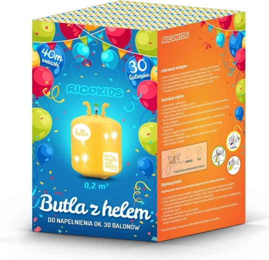 Prijenosna jednokratna helijeva boca Ricokids zapremine 0,20 m³ uključuje 30 šarenih balona i 40 m ukrasne vrpce za brzo i jednostavno napuhavanje. Idealno za rođendane, vjenčanja i dječje proslave – u nekoliko minuta stvorite atmosferu punu boja i radosti.