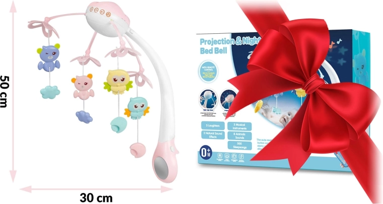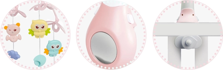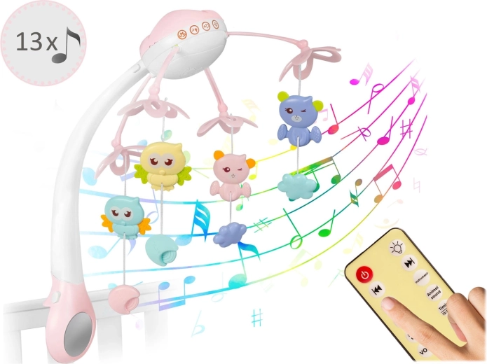 Umirite bebu nježnim pokretom, svjetlom i glazbom. Ovaj ružičasti vrtuljak za krevetić kombinira rotirajuće viseće igračke, noćno svjetlo s projektorom zvjezdica i daljinsko upravljanje za maksimalnu udobnost roditelja. Nudi 13 melodija, timer 10/20/30 min i sigurno, stabilno pričvršćenje na većinu dječjih krevetića.