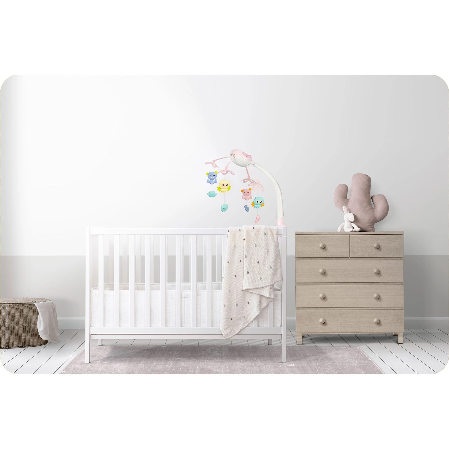 Četiri slatke viseće figurice tiho se okreću, potiču vizualnu percepciju i zabavljaju bebu tijekom budnih trenutaka.