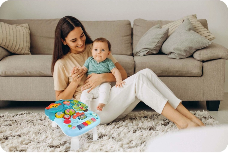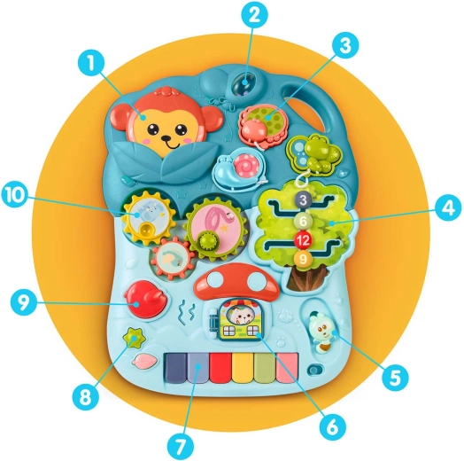 Odvojivi panel prepun je aktivnosti: šareni klavirčić, klinovi, zupčasti kotačići, tipke s pjesmicama i perkusivnim zvukovima, labirint s žicama, sparivanje oblika, zvučni efekti i drugo. Dijete tako na zabavan način upoznaje boje, oblike i brojeve te razvija finu motoriku i koordinaciju oko–ruka.