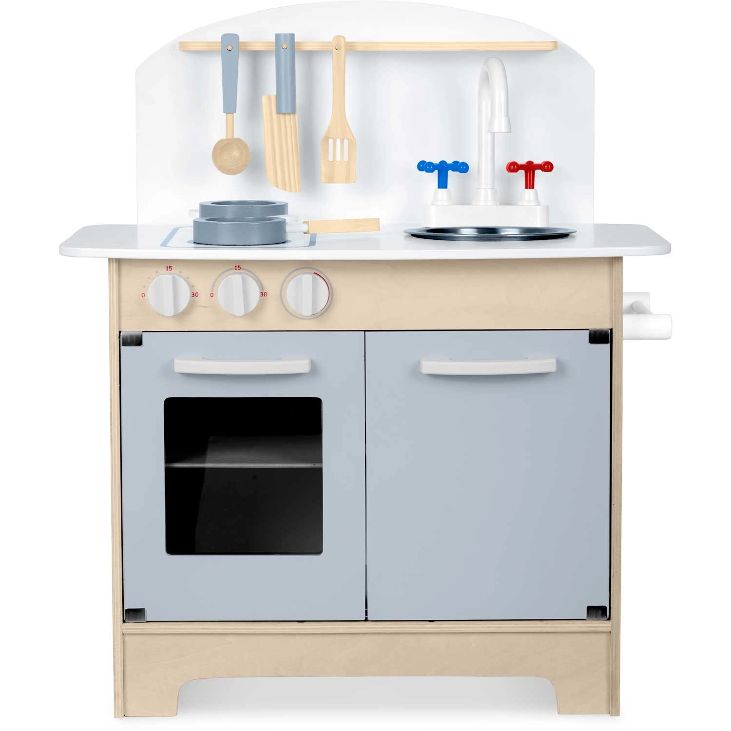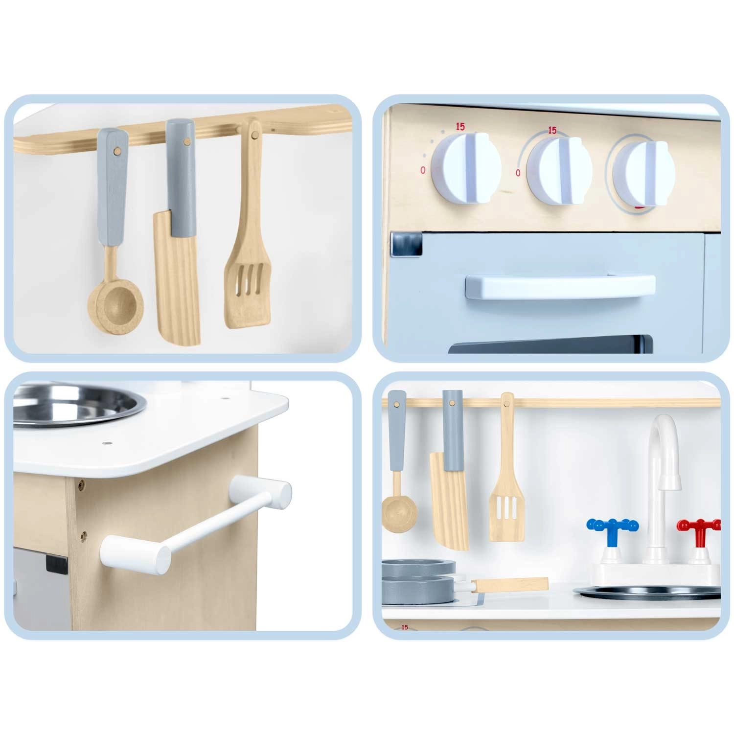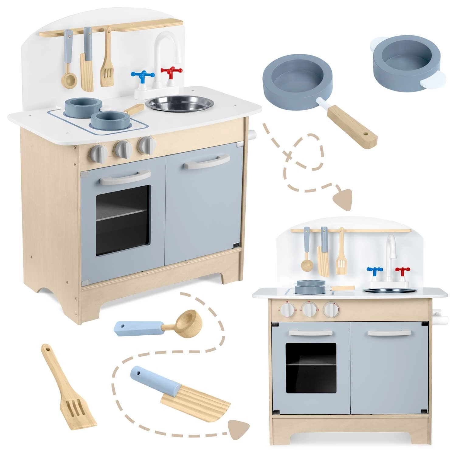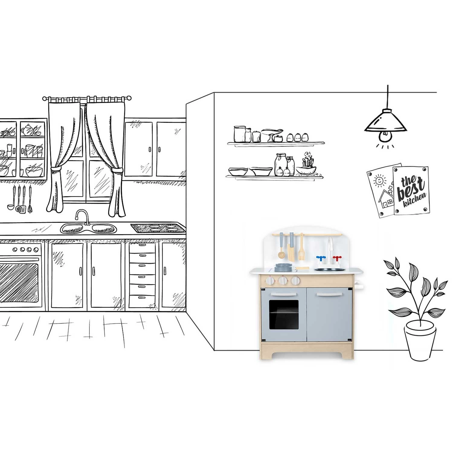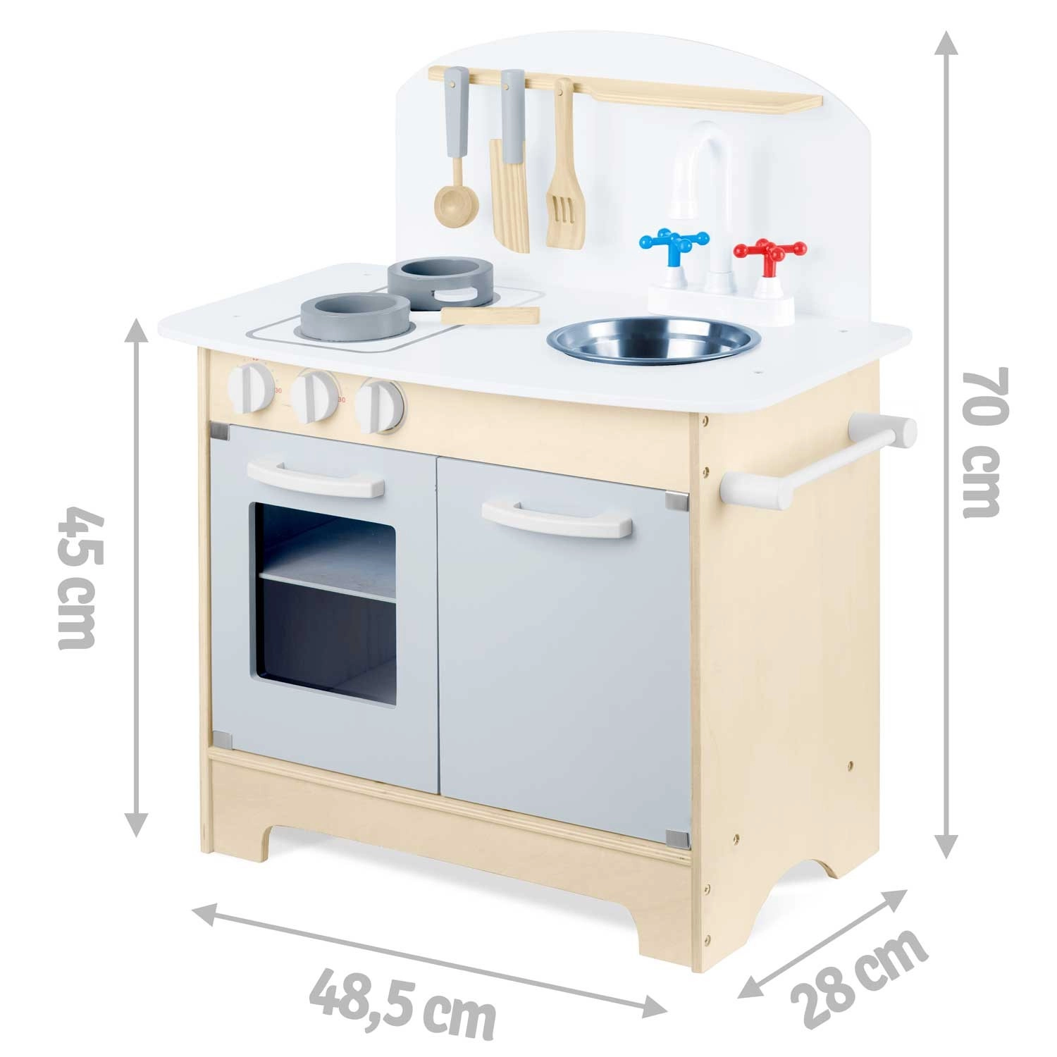 Promišljeni spremišni prostori poput ormarića za posuđe, polica i kukica za pribor te držača za papirnate ručnike održavaju red tijekom kuhanja. Uključena je i seta pribora: lonac, tava, žlica, lopatica i nož. Izdržljiva drvena konstrukcija u minimalističkom retro stilu postat će elegantan ukras dječje sobe.