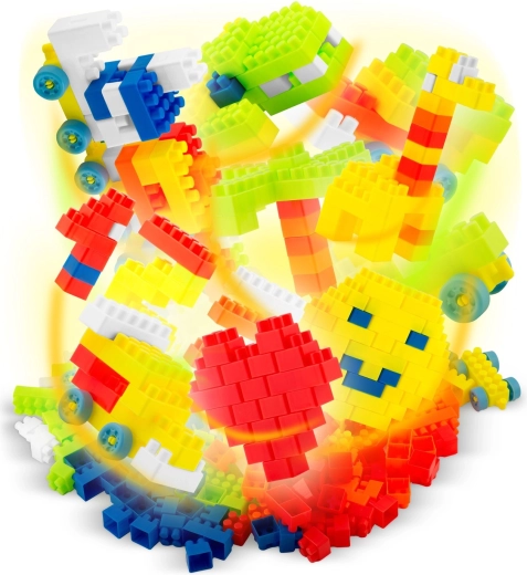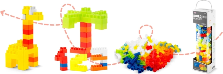 Set sadrži 300 kocaka u živim bojama (plava, žuta, crvena, narančasta, zelena) i dolazi u praktičnoj visokoj tubi koja služi kao spremnik i poklon-pakiranje. Odlično za igru kod kuće, u vrtićima i dječjim kutcima.