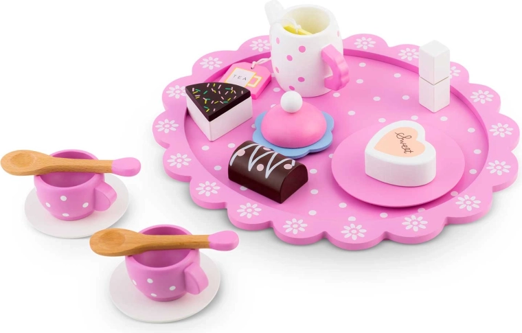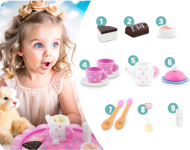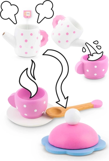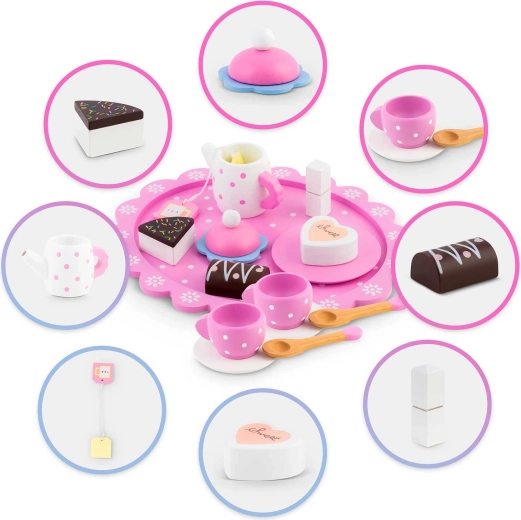 Set sadrži sve što je potrebno za realističnu čajanku: čajnik s poklopcem, 2 šalice s tanjurićima, žličice, poslužavnik, kocke šećera, vrećicu čaja i ukusne deserte (komad torte, keks i čokoladno srce). Djeca uvježbavaju koordinaciju ruka–oko, učenje uloga i društvene vještine.
