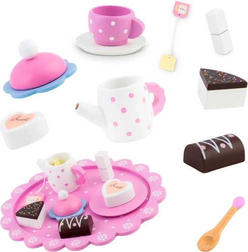 Čajnik s poklopcem, 2 šalice s tanjurićima, žličice, poslužavnik, vrećica čaja, kocke šećera i izbor deserata za realističnu igru uloga.