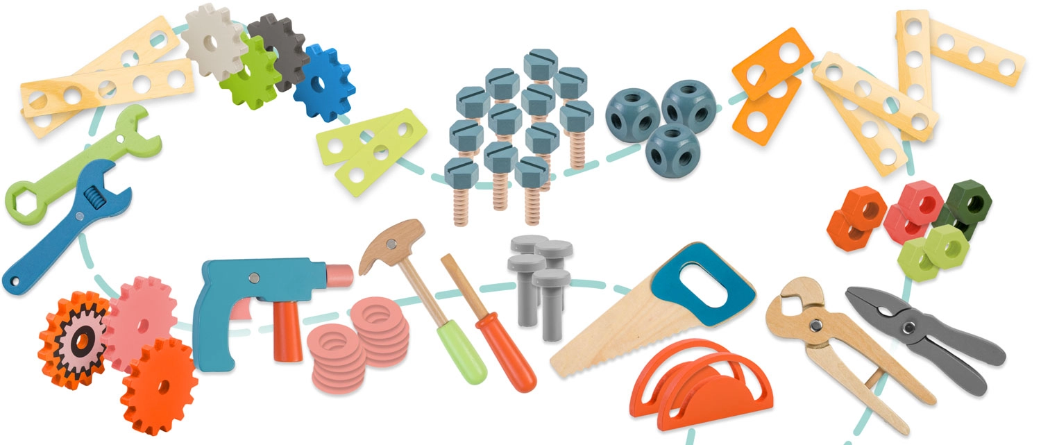 Ova drvena klupa sa širokim setom alata djeci pruža vlastitu mini radionicu. Zahvaljujući okretnim zupčanicima, funkcionalnom škripcu i brojnim vijcima i maticama mali majstori naučit će zatezati, vijati i sastavljati jednostavne konstrukcije. Promišljeni prostori za odlaganje i viseća ploča drže sve dijelove lijepo pri ruci.