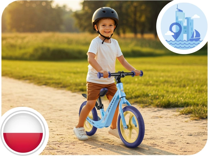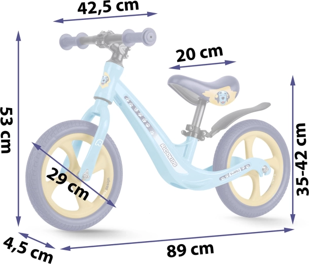Ergonomski oblikovano, meko pjenasto sjedalo s kontinuiranom regulacijom visine (oko 35–42 cm) raste s djetetom i omogućuje udobnu vožnju u svakoj fazi razvoja. Gumene ručke sa završecima štite ruke i poboljšavaju sigurnost držanja. Guralica potiče samopouzdanje, koncentraciju i prirodan prijelaz na klasični bicikl s pedalama.