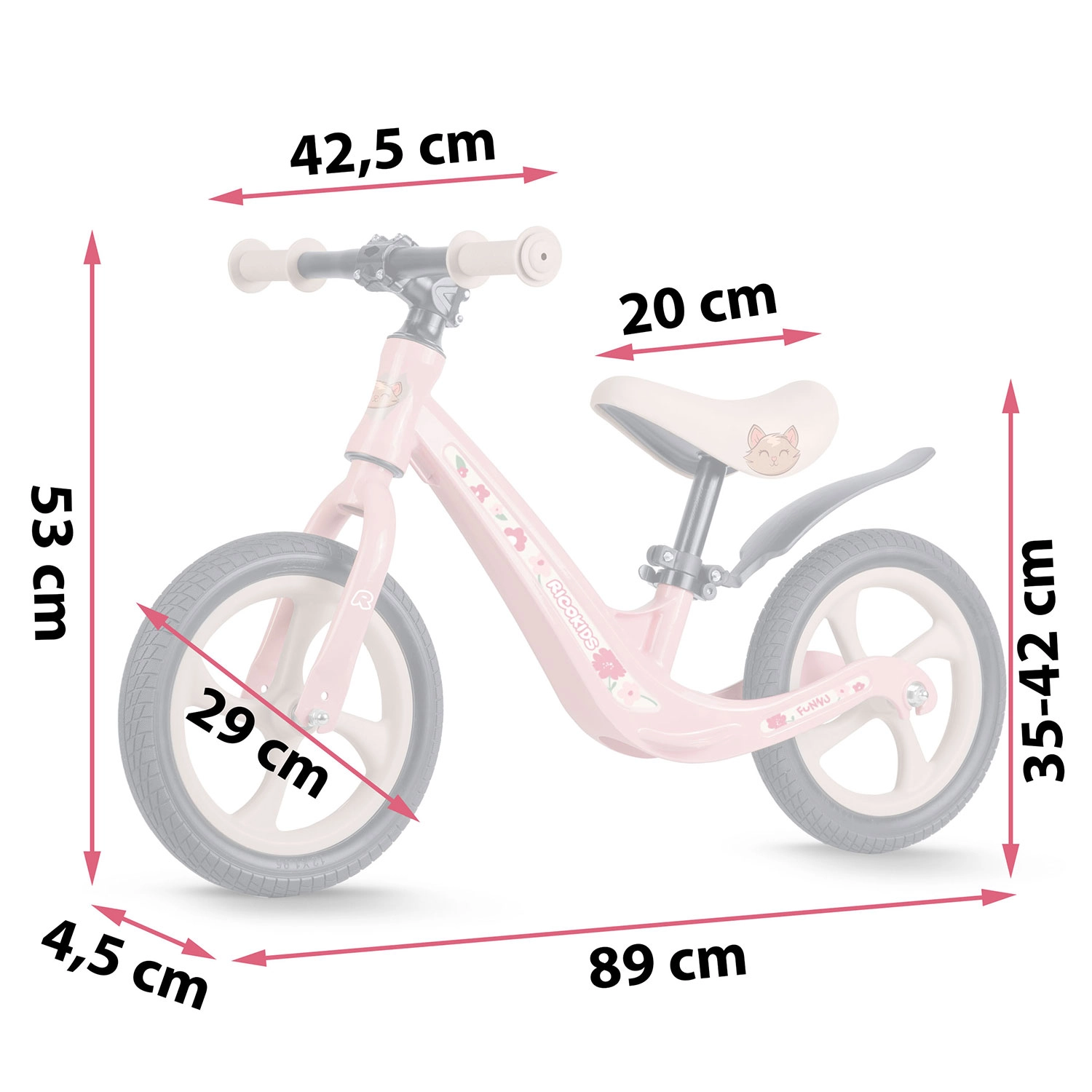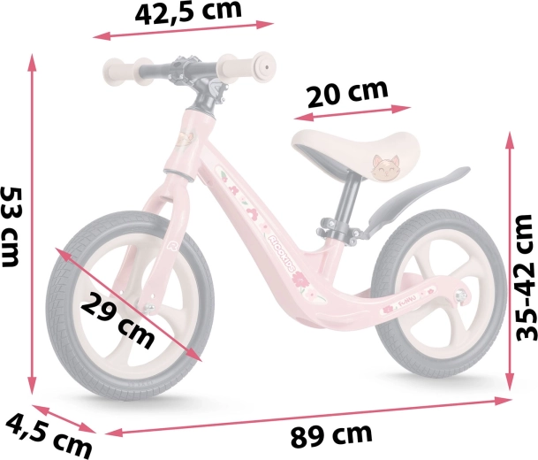 Raspon visine 35–42 cm omogućuje pravilan položaj sjedenja u svakoj fazi rasta. Ergonomsko pjenasto sjedalo osigurava udobnost na kraćim i dužim vožnjama.