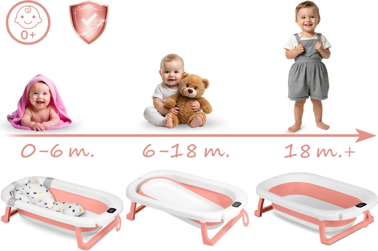 • Raste s djetetom – s umetkom (0–6 mj.), bez umetka za djecu koja sjede (6–18 mj.), te prostrano kupanje za veće (18 mj.+).