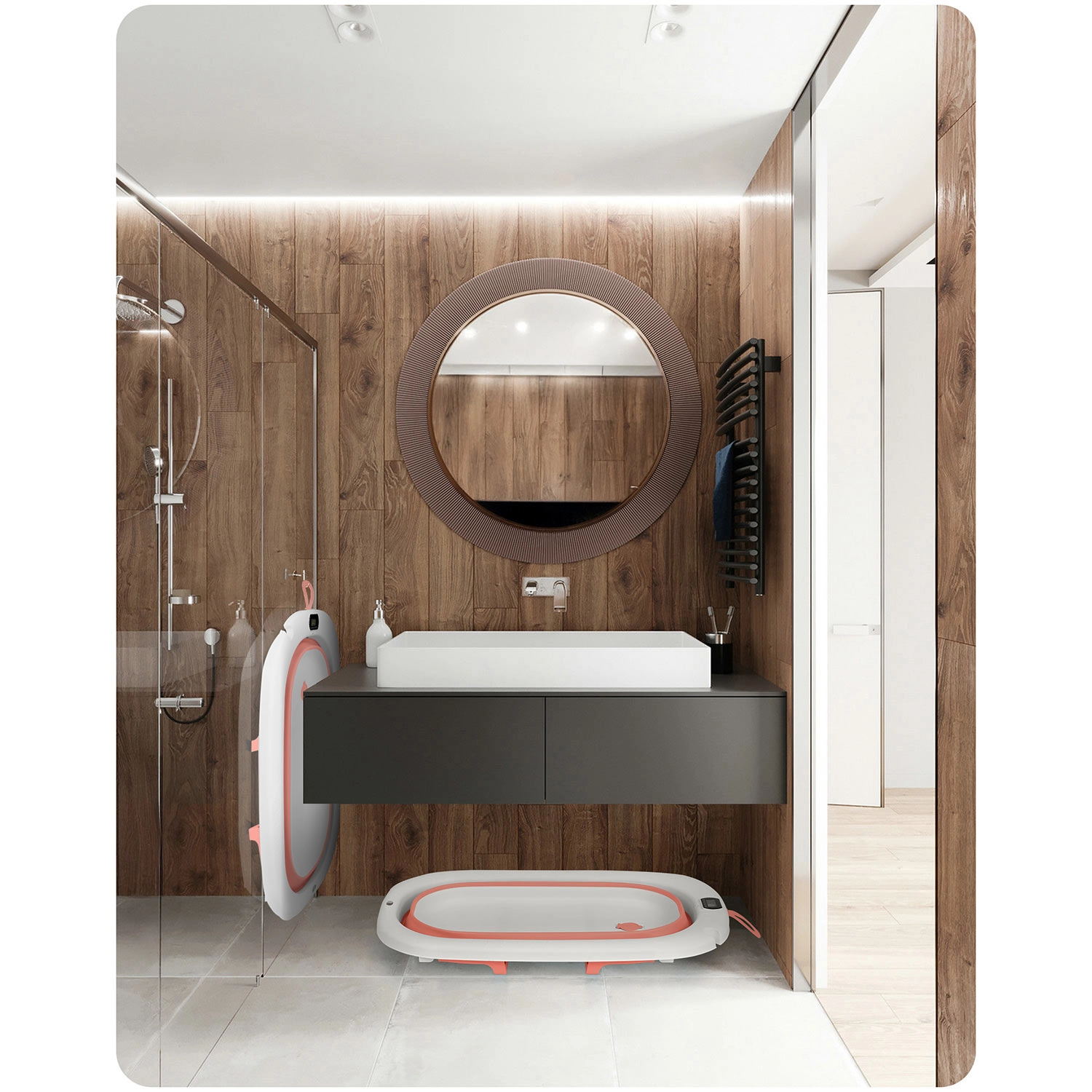 Preklopne noge s protukliznim završecima, ručke za prenošenje i kompaktno sklapanje štede prostor kod kuće i na putu. Integrirani držač tuša olakšava punjenje bez prskanja.