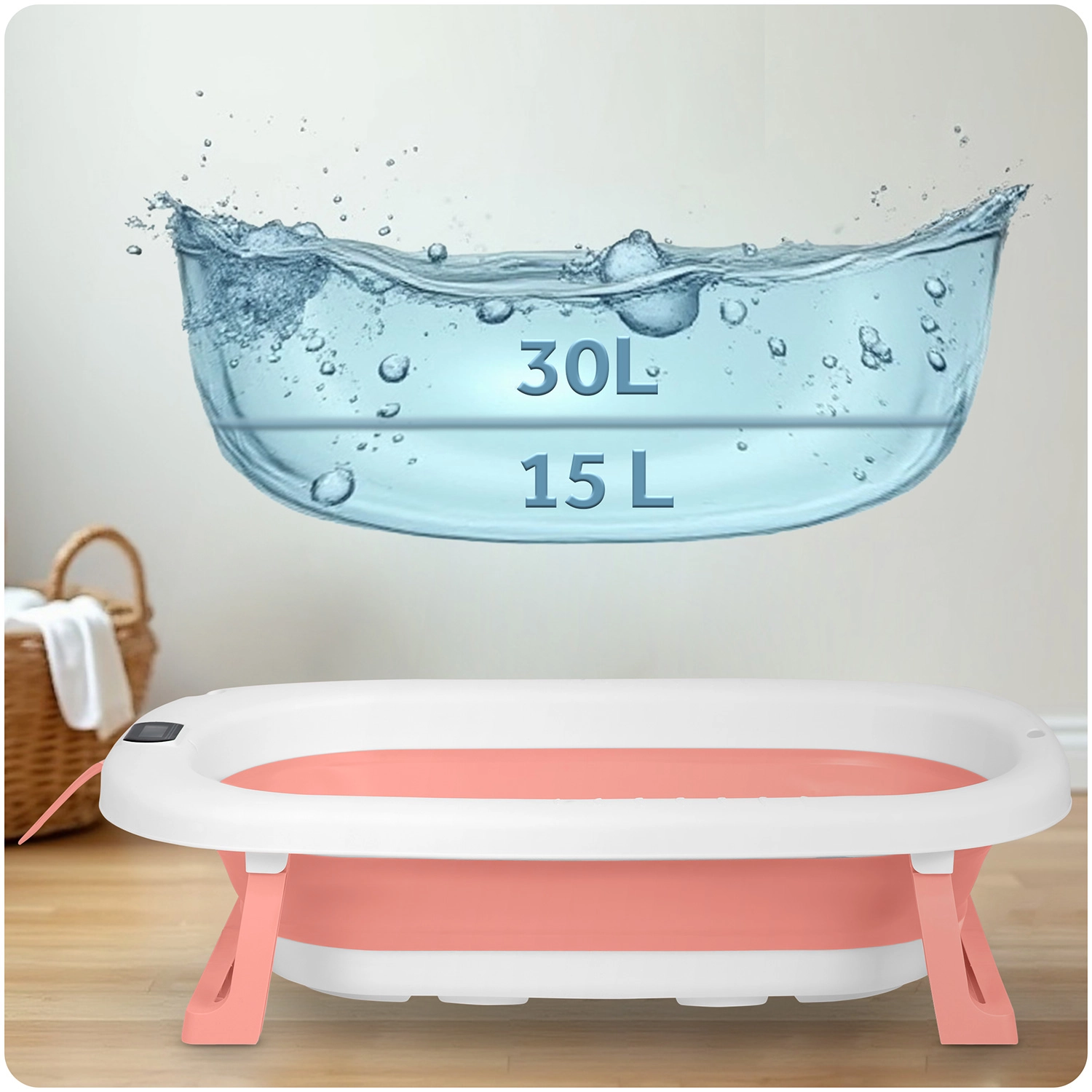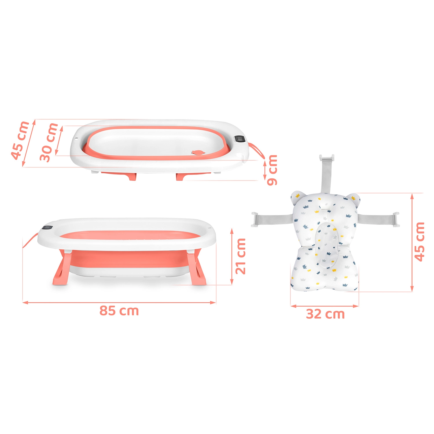 Praktična sklopiva dječja kadica s mekim umetkom za novorođenče i preciznim elektroničkim termometrom za maksimalnu udobnost i sigurnost. Zahvaljujući stabilnim preklopnim nogama, protukliznim završecima i obojenom indikatoru temperature, kupanje je jednostavno i sigurno. Kadica je lagana, kompaktna za spremanje i nudi nosivost do 45 kg, pa raste zajedno s vašim djetetom.