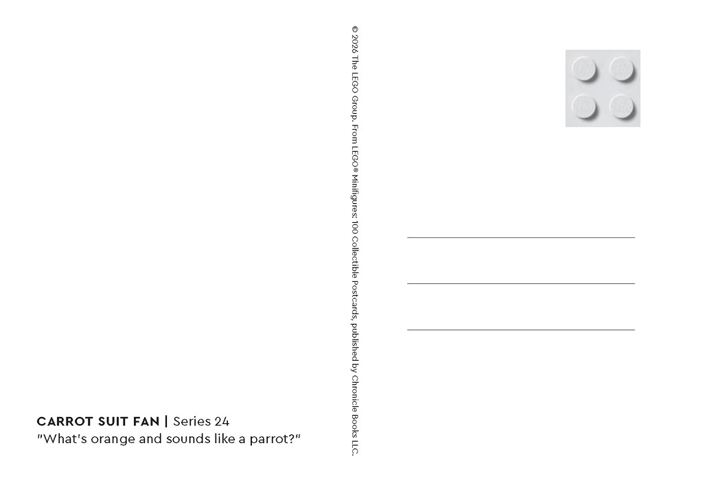 Na poleđini svake razglednice pronaći ćete dopunske informacije – naziv minifigurice, seriju te službeni slogan prožet tipičnim LEGO humorom. Set možete koristiti za slanje pozdrava, kao originalnu zidnu dekoraciju ili za stvaranje vlastite kućne LEGO galerije.