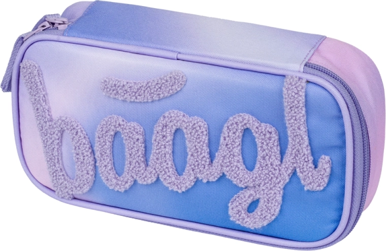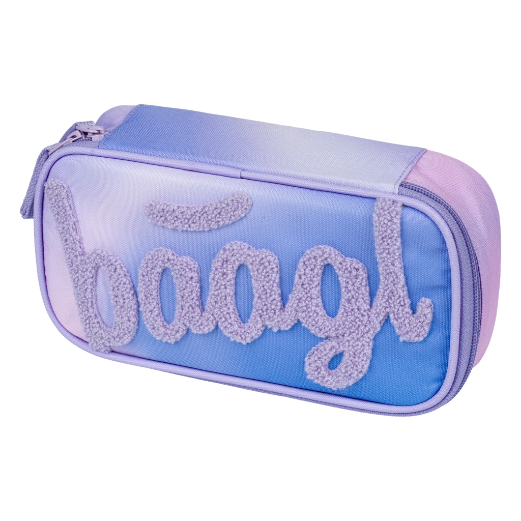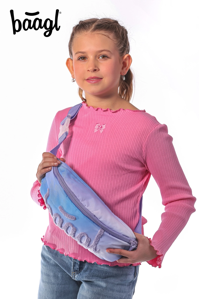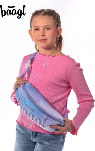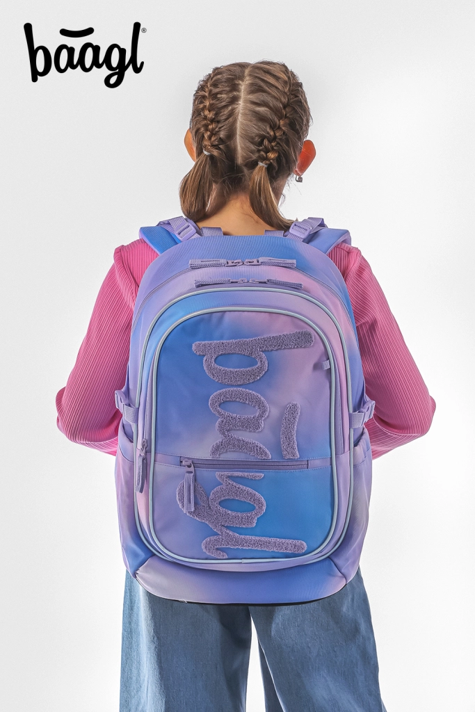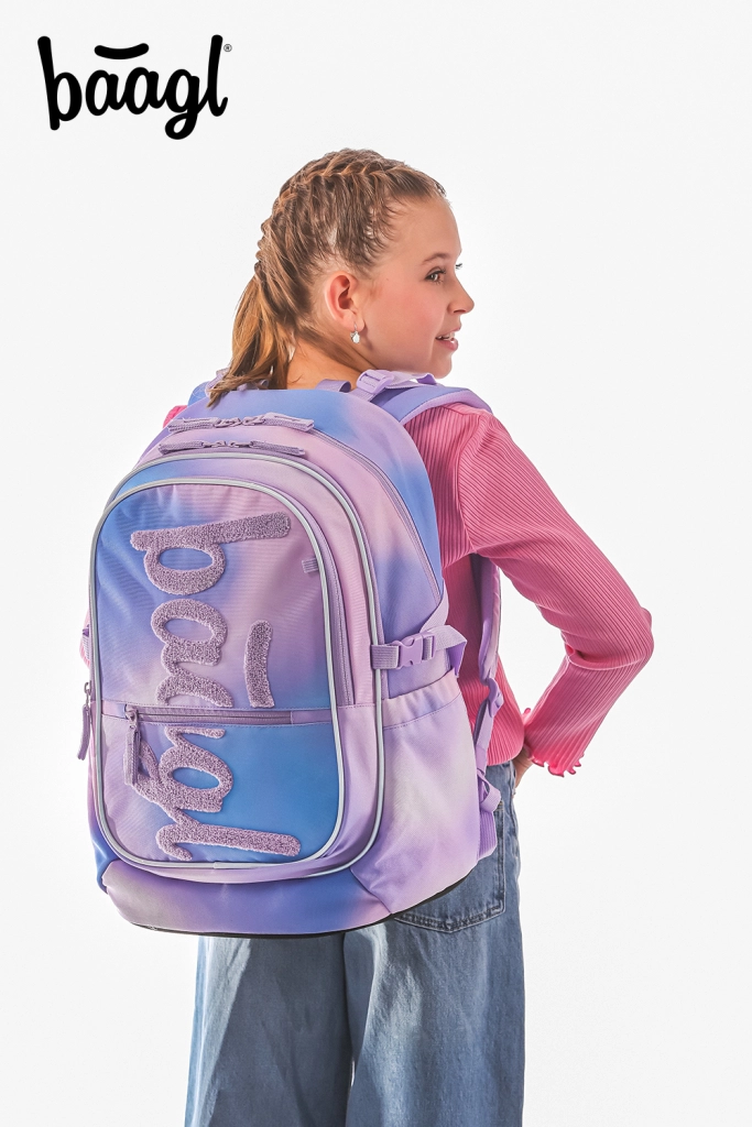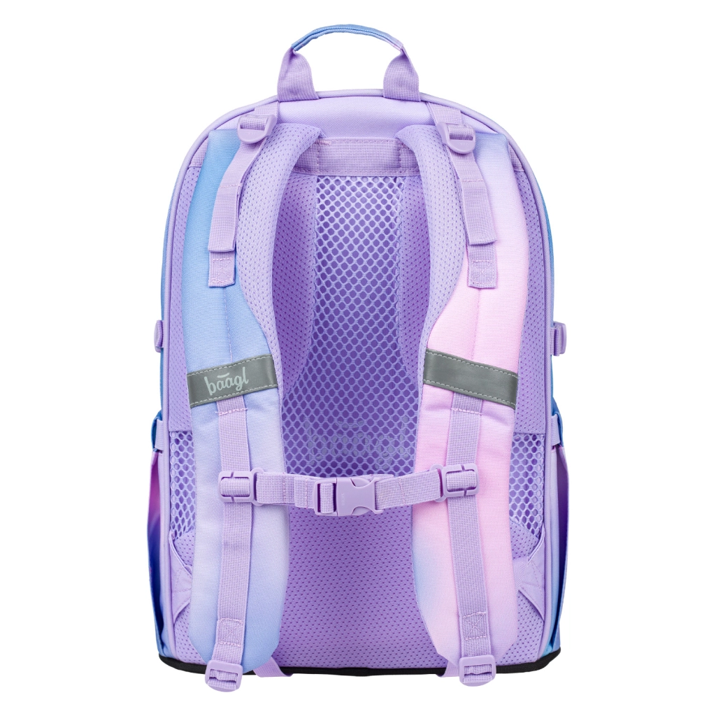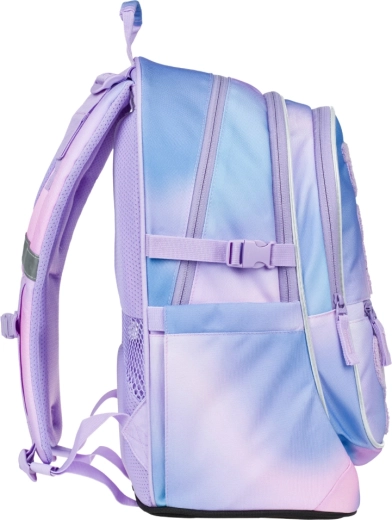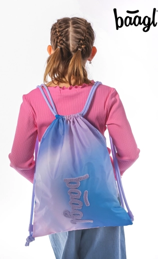 Uz ruksak se slažu pernica, vrećica za tjelesni, torbica za struk i navlaka za prijenosno računalo u pastelnom gradijentu. Praktična oprema za školu i slobodno vrijeme u jednom paketu.