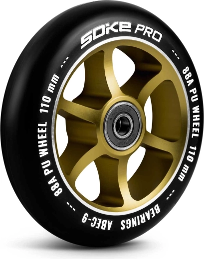 Set od dva SOKE kotača 110 mm donosi pouzdane performanse za svakodnevnu vožnju i trikove. Poliuretan 88A nudi odličan kompromis između prianjanja i brzine, dok se ležajevi ABEC‑9 brinu za iznimno gladak rad. Aluminijska jezgra u zlatnoj boji povećava krutost i izdržljivost pri doskocima i zahtjevnim manevrima.