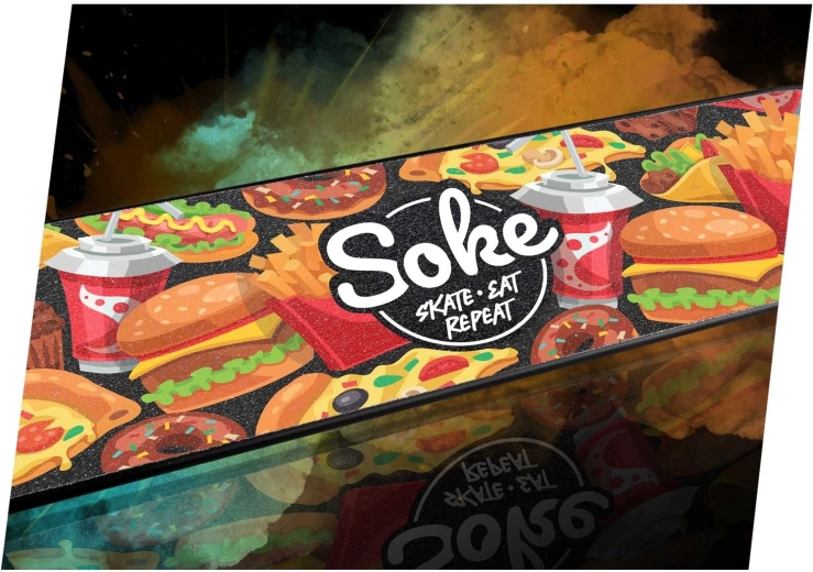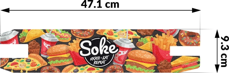 Poboljšajte kontrolu nad svojim romobilom uz grip traku SOKE Go! – Fast Food. Grublja zrnastost nudi čvrst i stabilan kontakt između cipele i decka, tako da se možete u potpunosti usredotočiti na učenje novih trikova i naprednih kombinacija. Stilski tisak daje vašem decku originalan izgled i istaknut će vas u parku i na ulici.