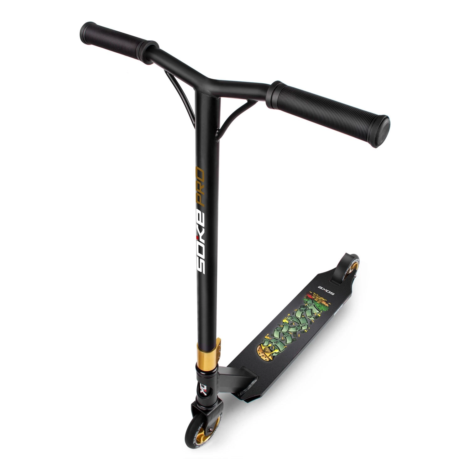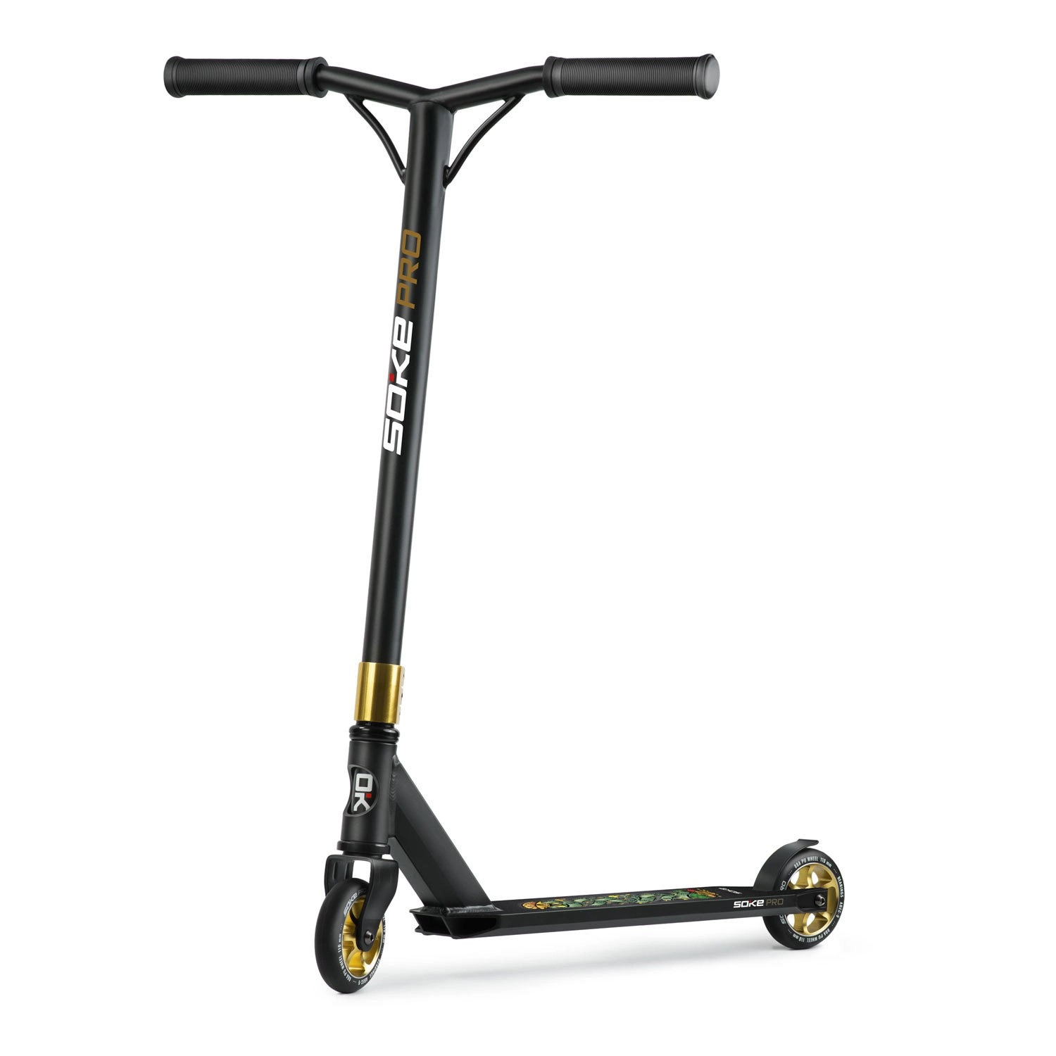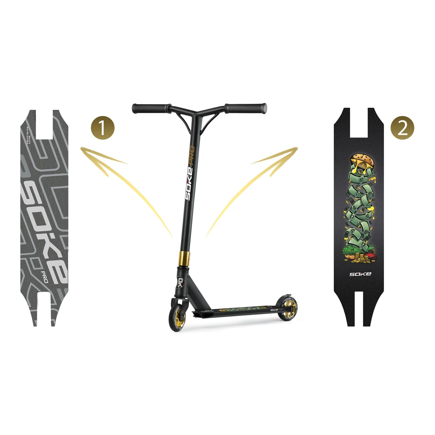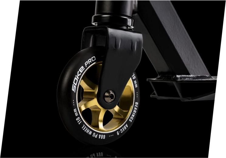 Tražite romobil koji podnosi intenzivan trening i zahtjevne trikove? Soke Pro Gold spaja odličan omjer cijene i kvalitete s komponentama provjerenim od vozača: ABEC-9 za glatku brzinu, 110 × 24 mm PU 88A za idealno prianjanje i čvrstu aluminijsku dasku (deck) s peg-cut oblikom za grindove i whipove. Stabilna Y/T upravljačka štanga 50,5 cm s 145 mm TPR gripovima osigurava udobnost i kontrolu.