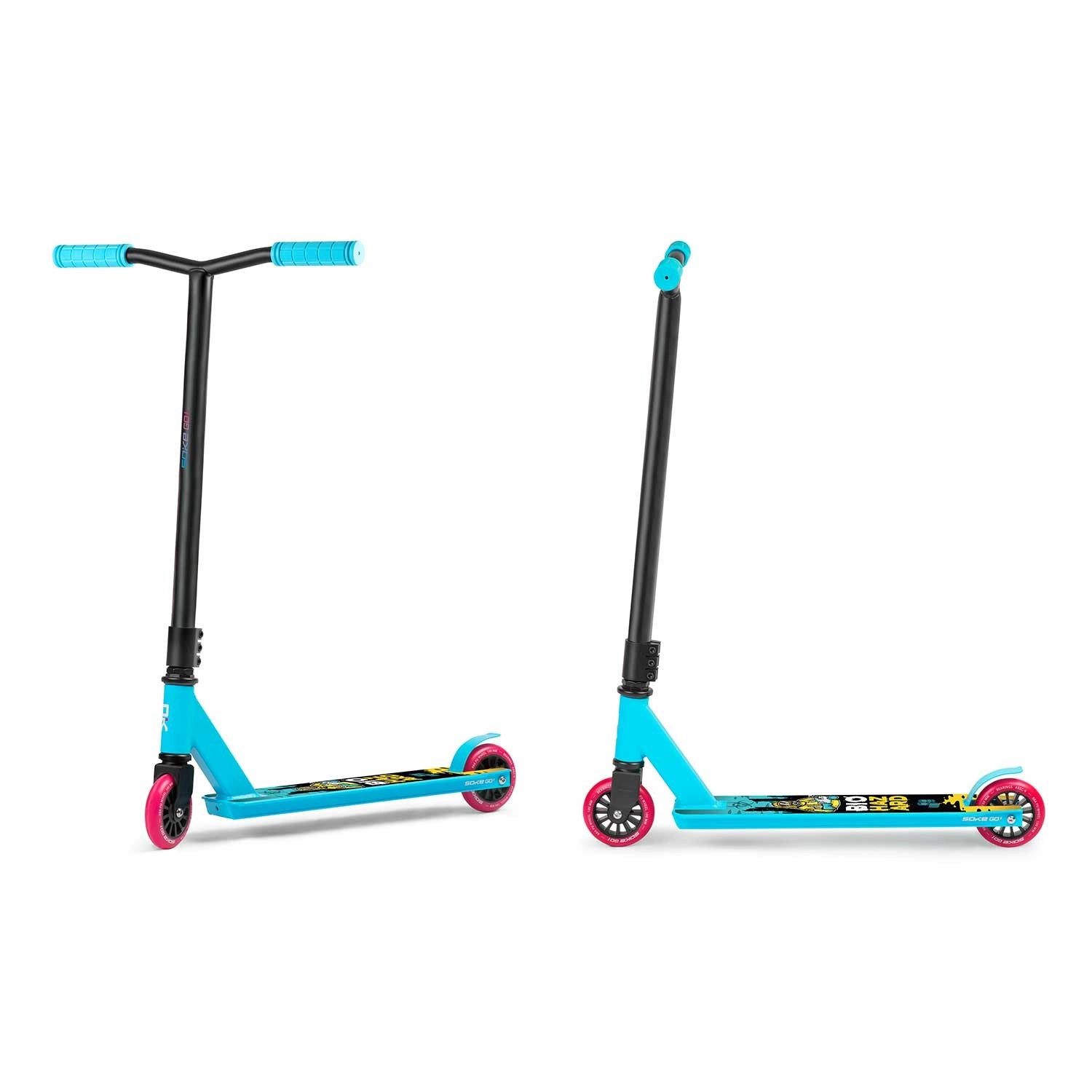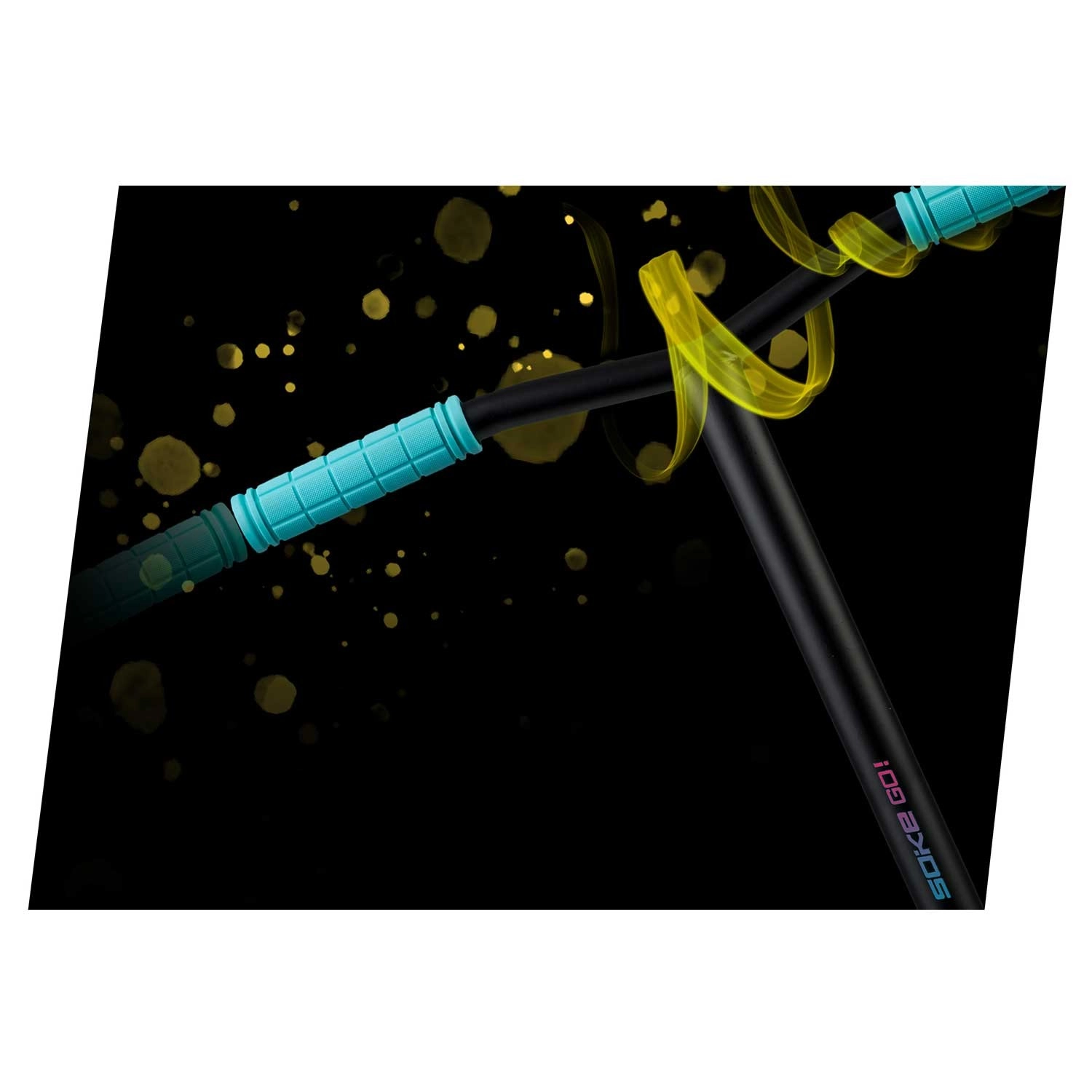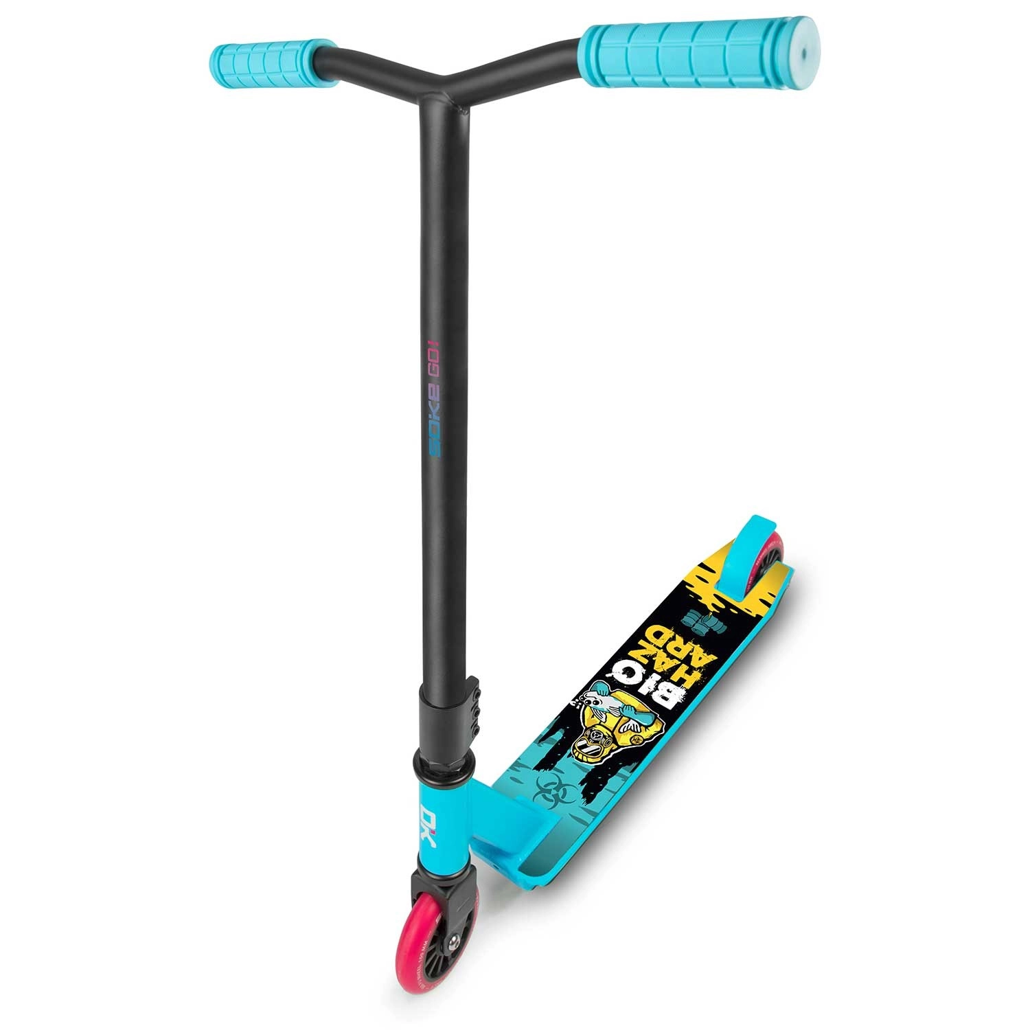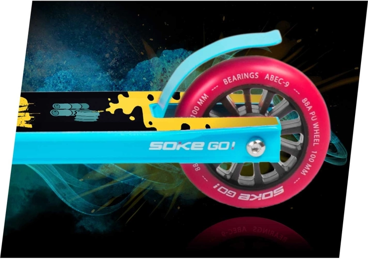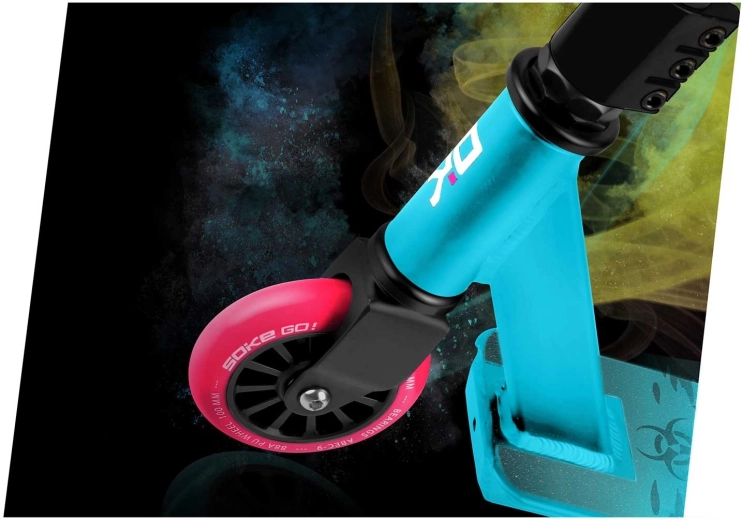 Model SOKE GO! u tirkiznoj boji dizajniran je za sigurnost pri trikovima, brzu akceleraciju i dugi vijek trajanja. Široka Y upravljača s udobnim TPR gripovima 145 mm daju izvrsnu stabilnost, dok krut aluminijski trostruki stezač drži sve čvrsto na okupu. Niska masa od 2,9 kg pomaže pri whipovima i spinovima.