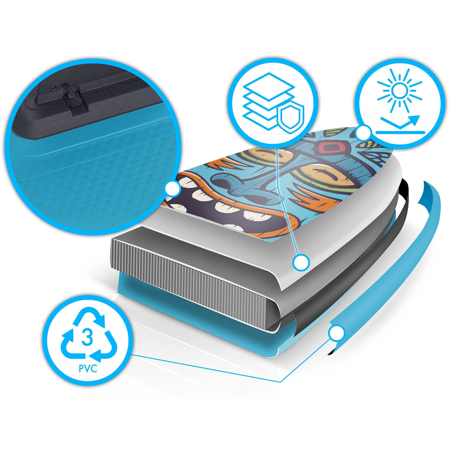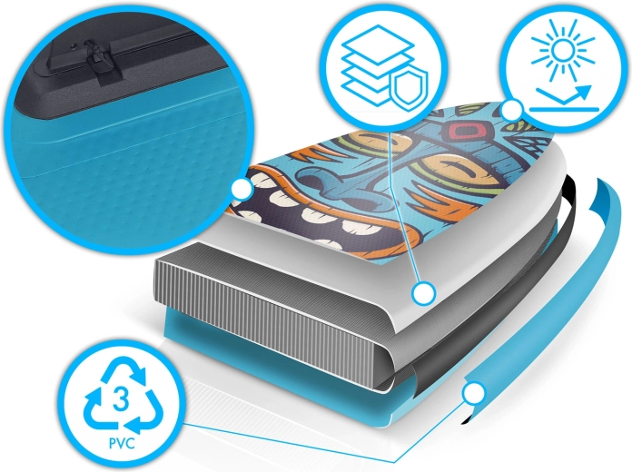 Višeslojni PVC s tehnologijom drop-stitch light osigurava nisku masu, visoku krutost i dugi vijek trajanja čak i pri čestoj upotrebi na suncu.