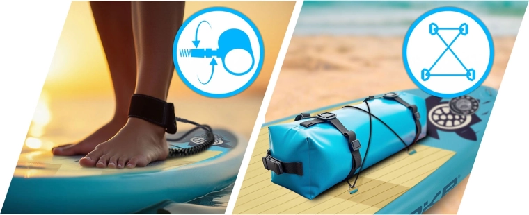 - Daska, pumpa, veslo, leash, odvojiva peraja (fin), sjedalo, ruksak, set za popravak (PVC zakrpe, ljepilo, ključ ventila, kućište)
