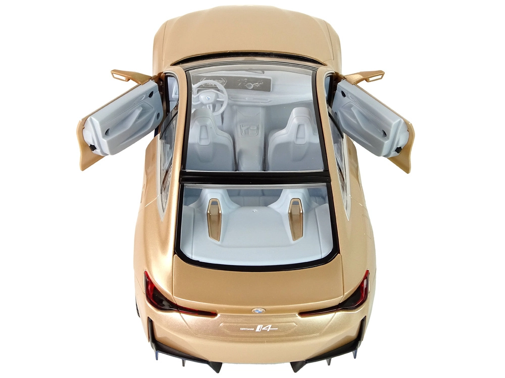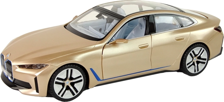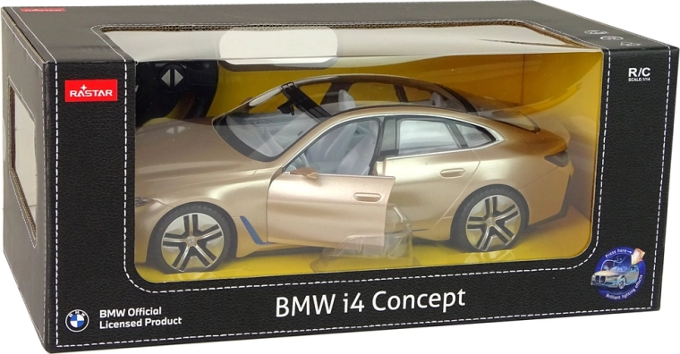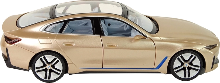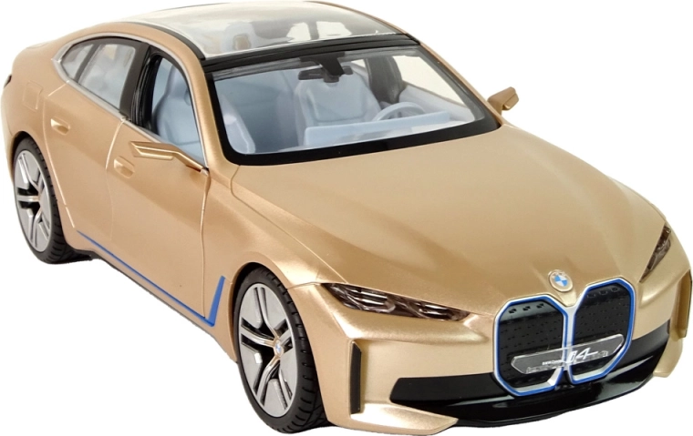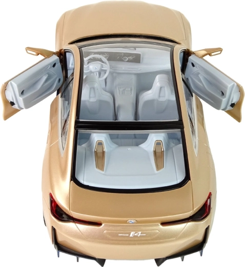 Detaljna karoserija BMW-a i4 s panoramskim krovom, preciznim linijama i sjajnim zlatnim lakom u mjerilu 1:14 izgleda izvrsno na stazi i u vitrini.