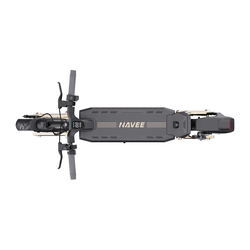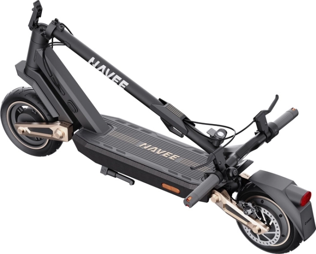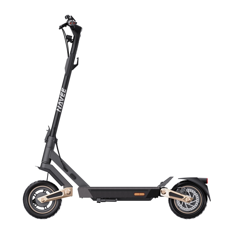 Bezzračne 10" samopopravljajuće gume s gel slojem odolijevaju probijanjima do cca 4 mm. Široka upravljačka ručka s nagibom od 5° poboljšava ergonomiju, a proširena podnica povećava stabilnost. Pametne funkcije uključuju Apple Find My, otključavanje približavanjem, ambijentalnu rasvjetu s 15 načina rada i upravljanje putem aplikacije NAVEE.