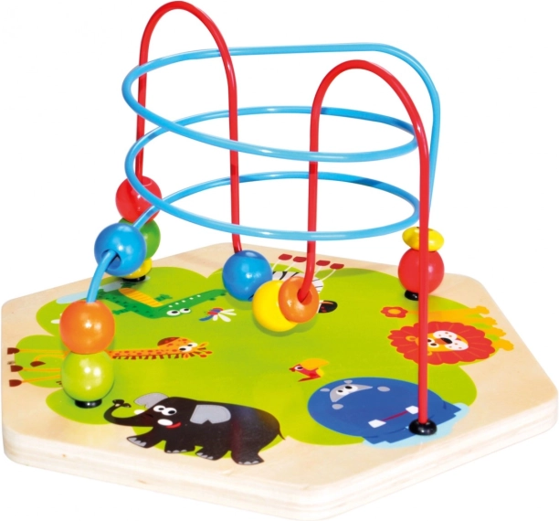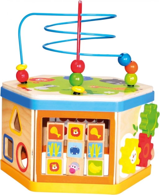 Višestrana motorička igračka zaokupit će znatiželjnu djecu živim bojama i mnoštvom ponuđenih aktivnosti obogaćenih didaktičkom dimenzijom. Mogu se voditi perlice kroz labirint, brojati kuglice, pomicati ikone životinja, okretati ih i pridruživati im hranu, okretati zupčanike, umetati kocke i učiti prepoznavati vrijeme. Igračka je robusna, izrađena od čvrste šperploče. Glavne značajke: kocka s poklopcem i 3 dijela za umetanje, razvijajte orijentaciju u prostoru i vremenu, pridružujte oblike i boje, vježbajte finu motoriku, robusna drvena izvedba