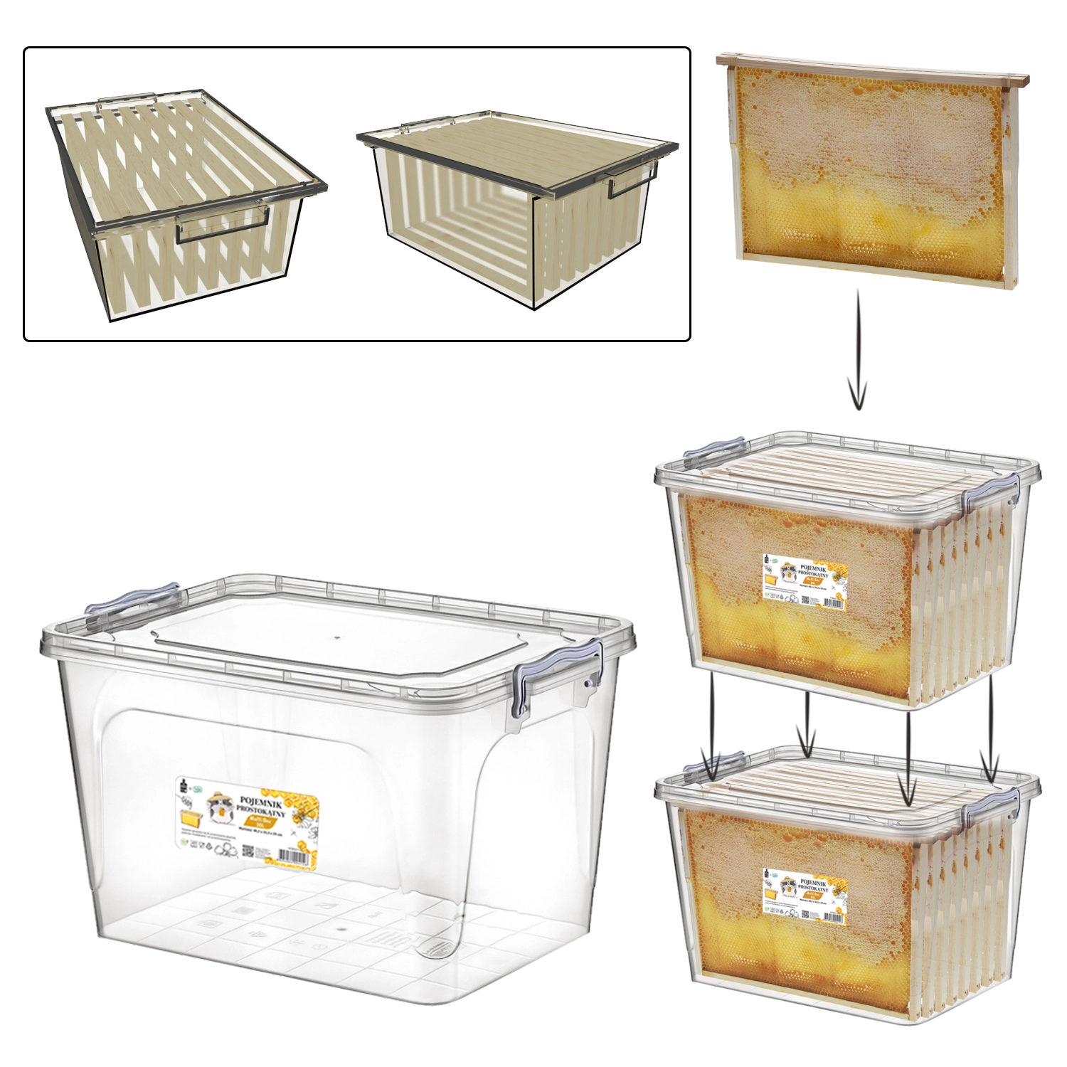 Praktična i izdržljiva spremna kutija zapremnine 30 l za sigurno skladištenje pčelarskih okvira. Zahvaljujući posebnim izbočinama okviri se ne dodiruju sa stijenkama, tijesni poklopac štiti od štetnika, a prozirna izvedba olakšava kontrolu sadržaja. Kutija je slagiva, ima bočne ručke za lako prenošenje i prima do 8 okvira (Wielkopolska) ili 16 okvira 1/2.