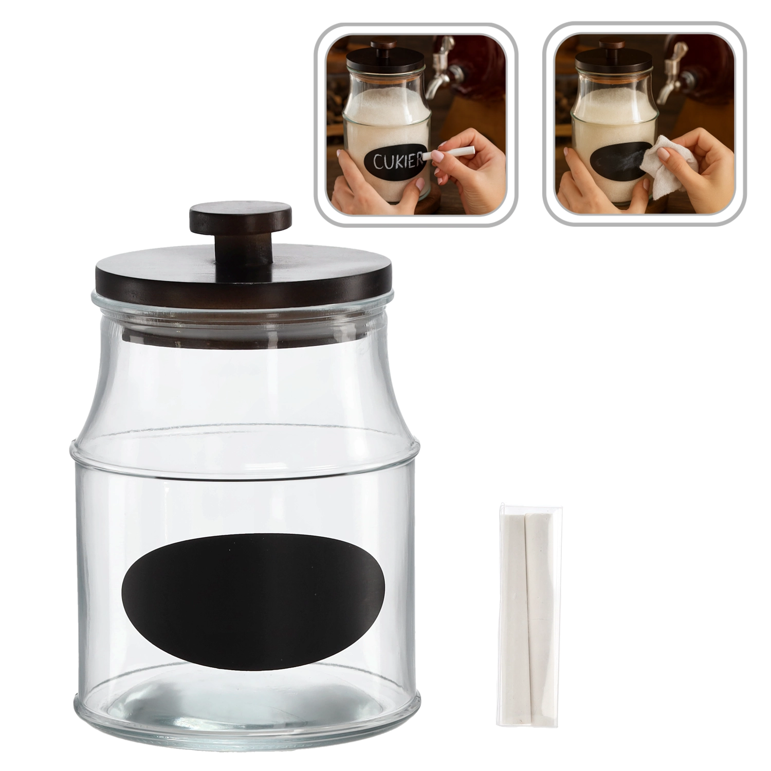 Praktična staklena tegla zapremine 2,2 l idealna je za pohranu većih zaliha namirnica – meda, džemova, začina ili domaćih zimnica. Ima brtveni drveni poklopac za očuvanje svježine, a dio pakiranja su i crna etiketa za opis te kreda za jednostavno označavanje sadržaja. Odlično rješenje za organizaciju kuhinje i smočnice, ujedno i stilski dekorativan element.