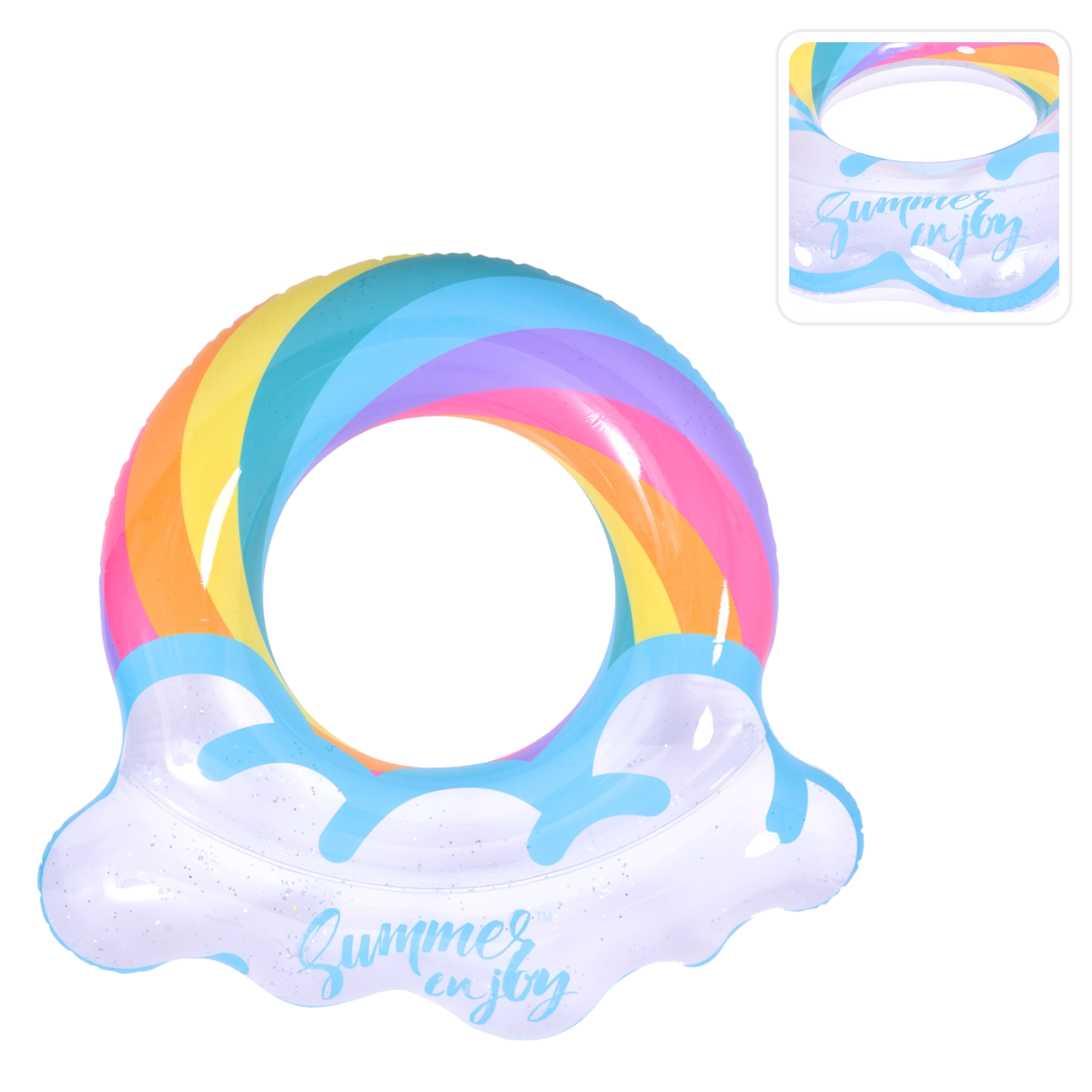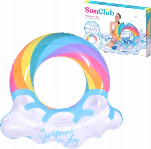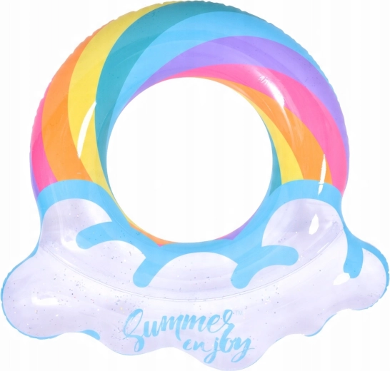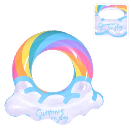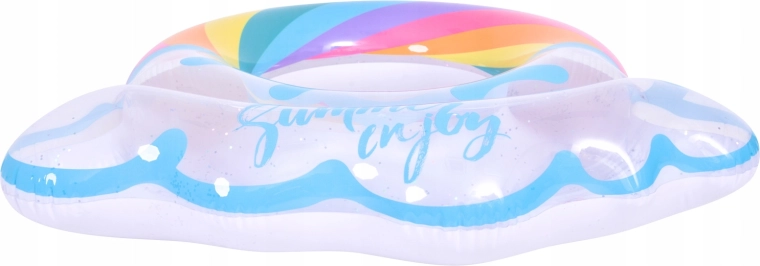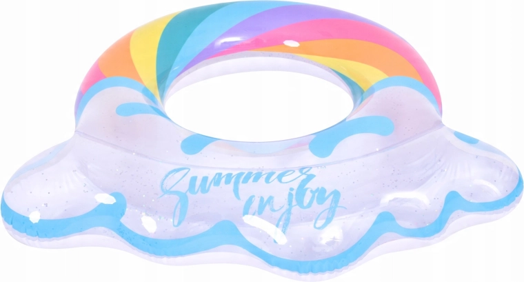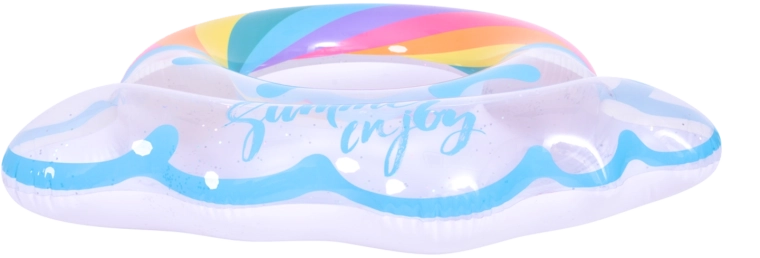 Nafukavajući prsten s motivom duge i rubovima poput oblaka savršen je suputnik za ljetnu zabavu. Prozirno tijelo s obojenim prugama i svjetlucavim česticama osigurava izvrsnu vidljivost na vodi i ističe se na svakoj fotografiji. Zahvaljujući čvrstoj vinilnoj konstrukciji prsten je otporan na habanje i uobičajeno trošenje.