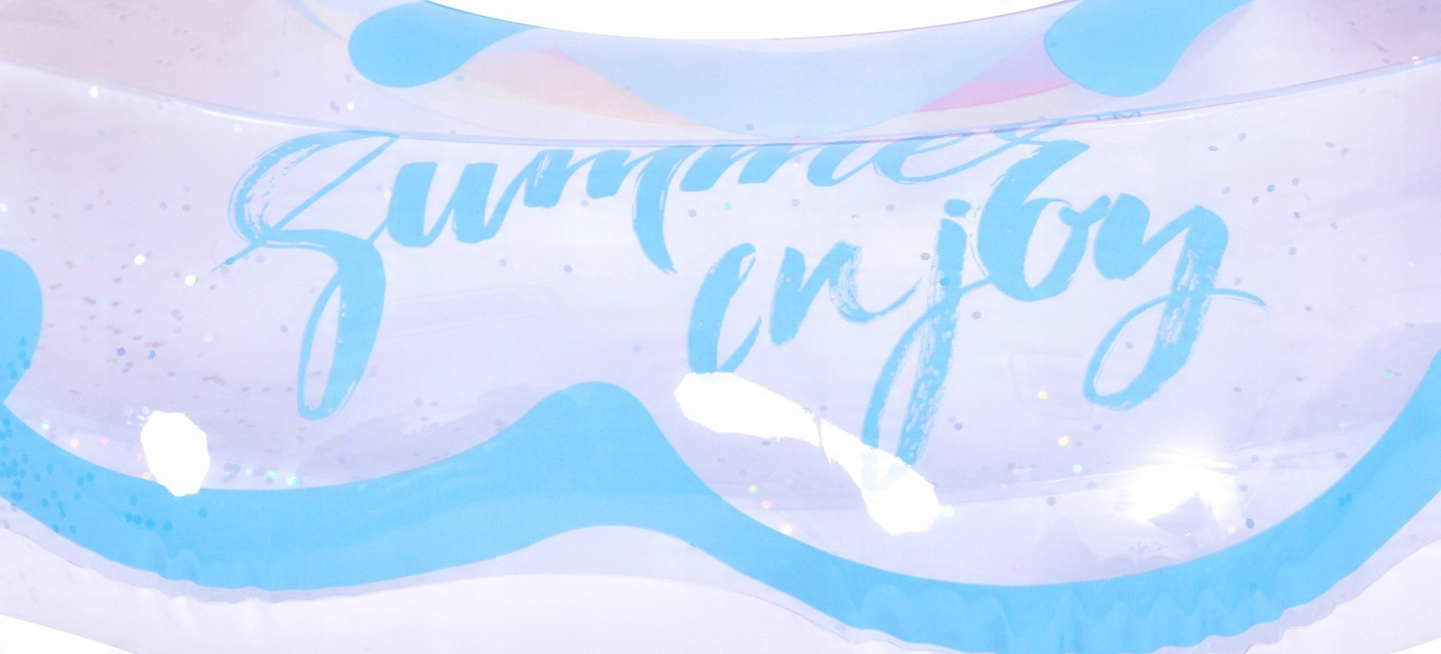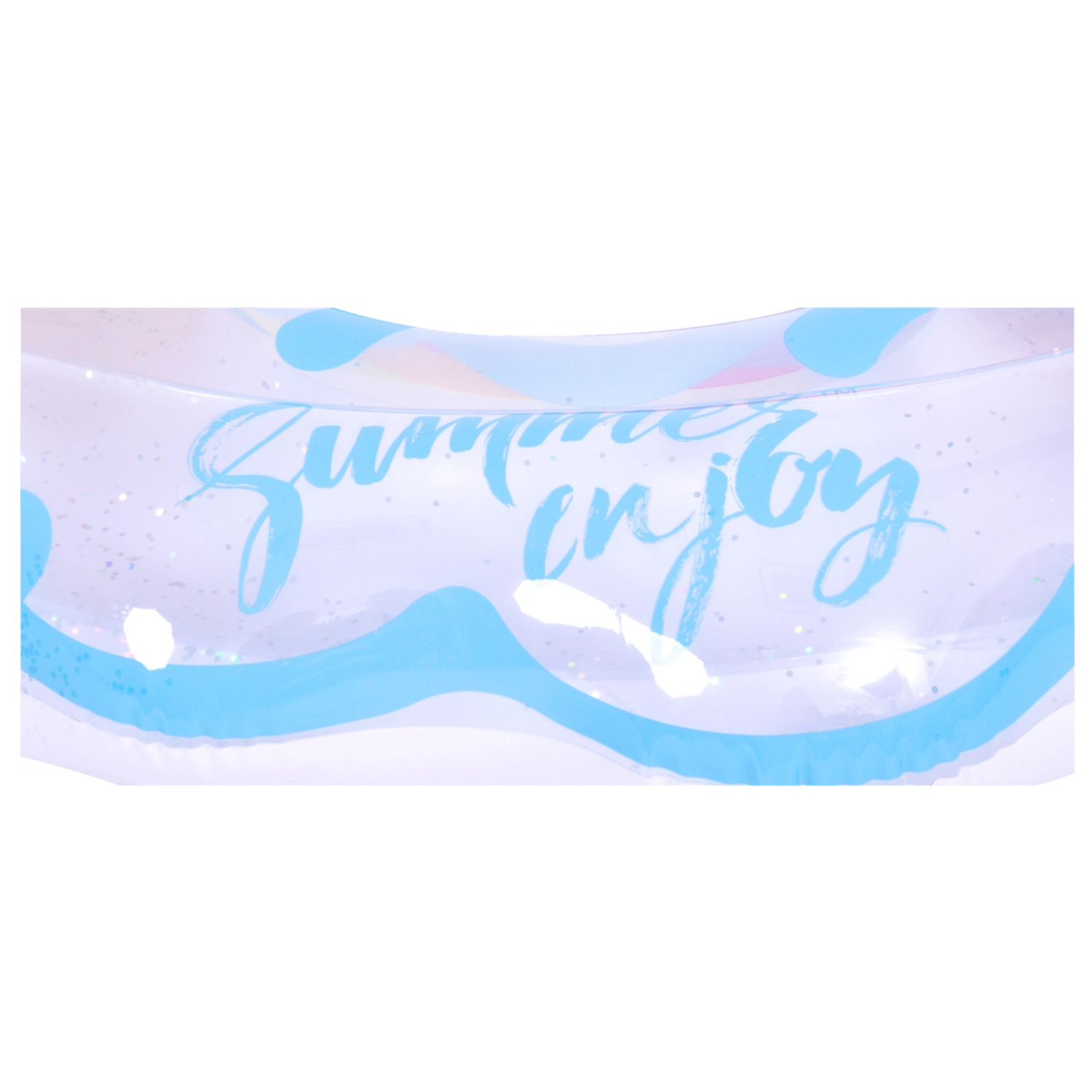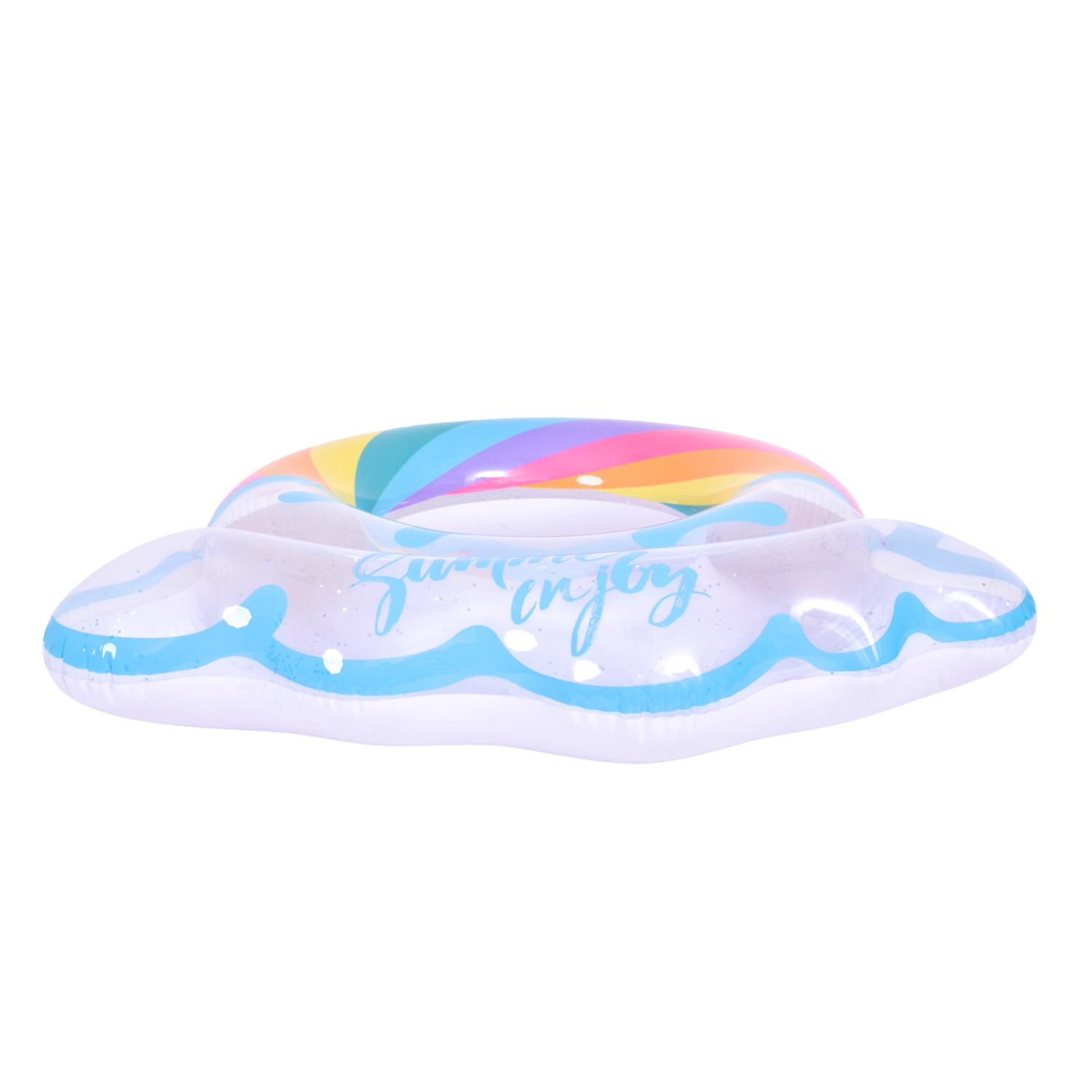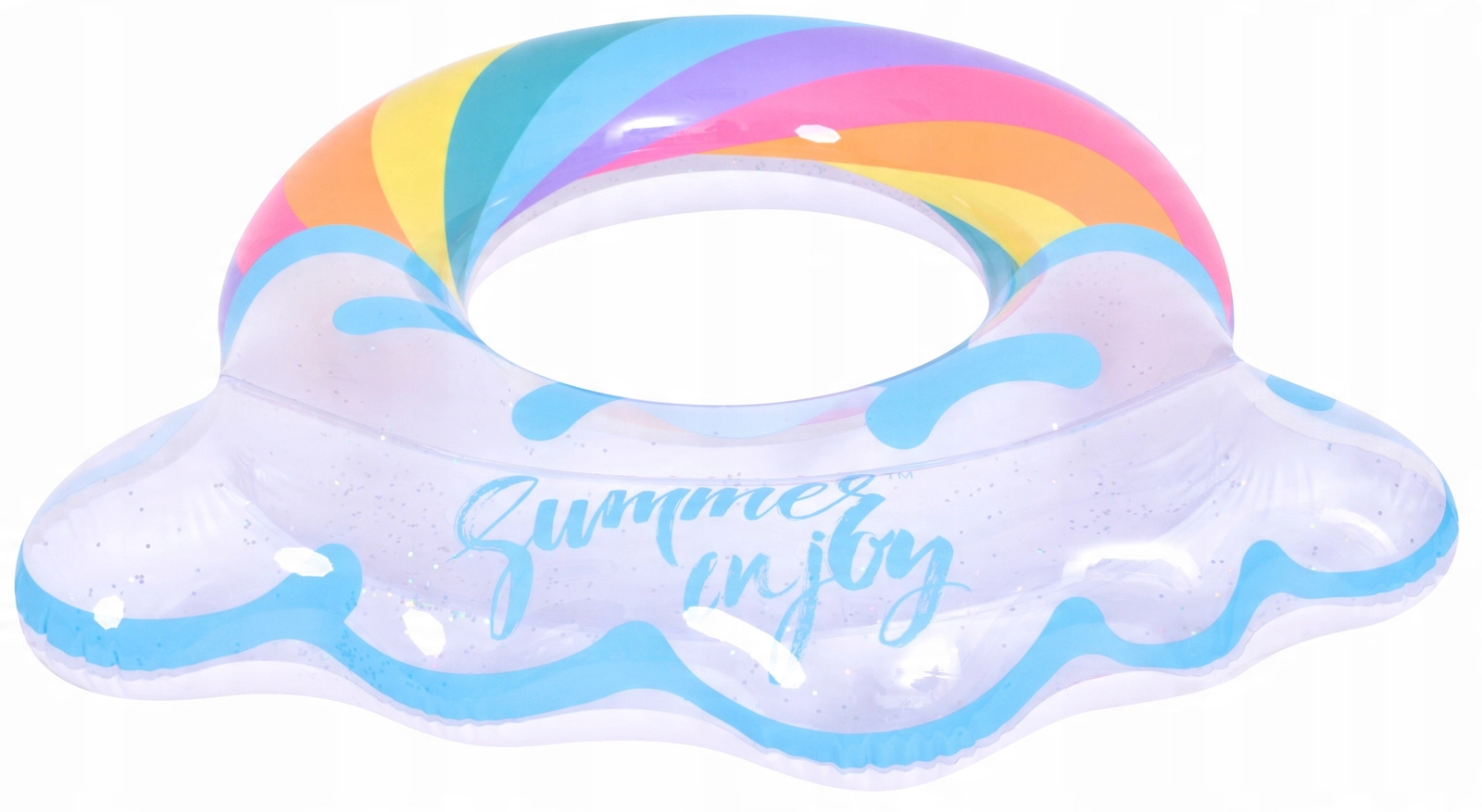 Uživajte u ljetu do kraja s ovim stilskim nafukavajućim prstenom u obliku duge. Prozirni dizajn s plavim naglascima i sjajnim šljokicama daje vodenim radostima poseban šarm. Idealan za bazen i more, izrađen od izdržljivog vinila za dug vijek trajanja i sigurno plivanje i opuštanje. Veliki promjer 106,5 × 103 cm osigurava udobnost za tinejdžere i odrasle 12+.