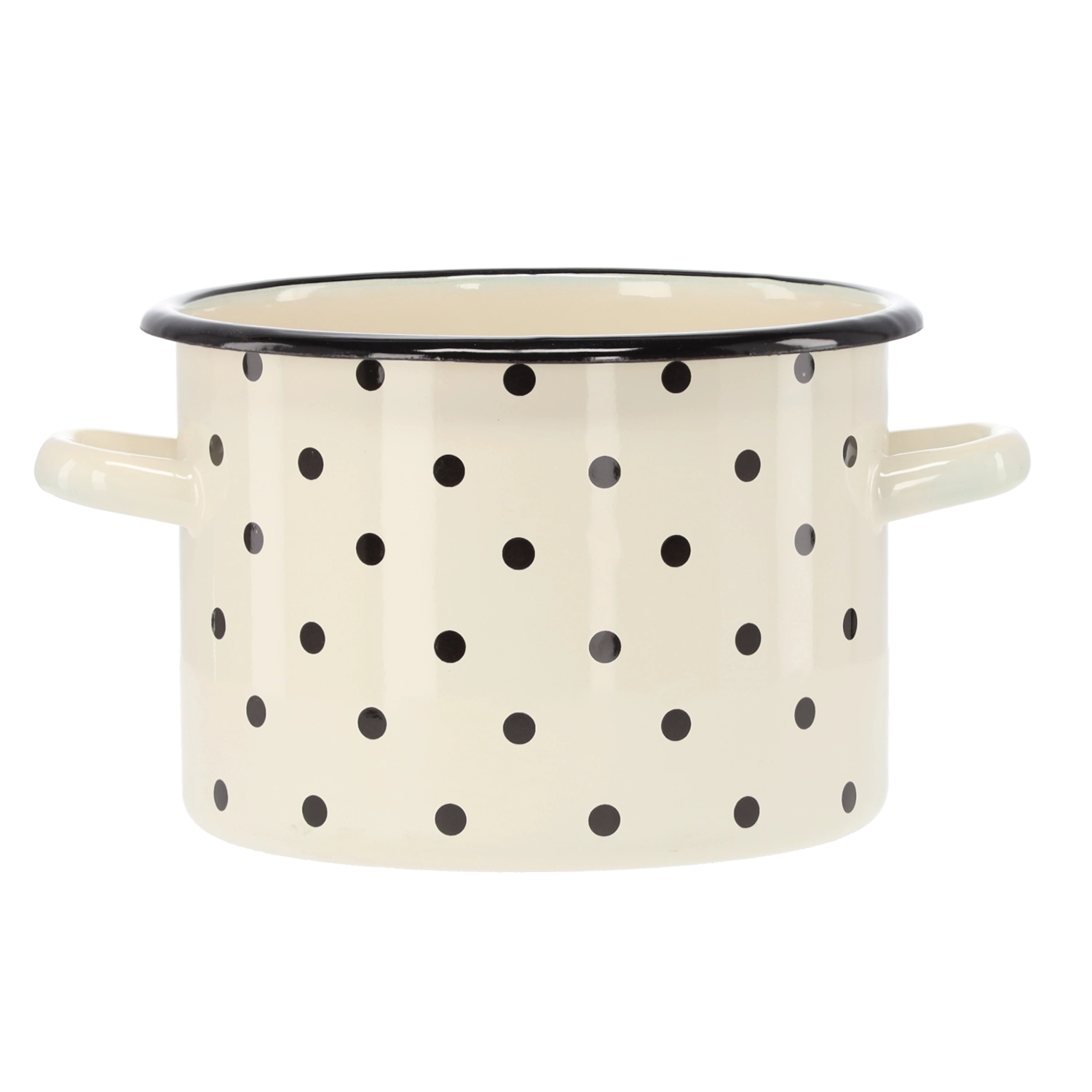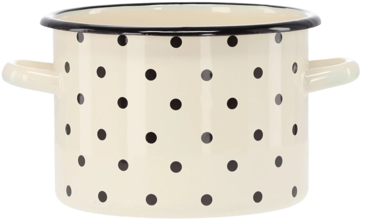 Stilski emajlirani lonac zapremine 3 l i promjera 18 cm u bijeloj boji s dekorativnim točkicama. Izvrstan za svakodnevno kuhanje, od juha do umaka; emajlirana površina je otporna, higijenska i lako se čisti.