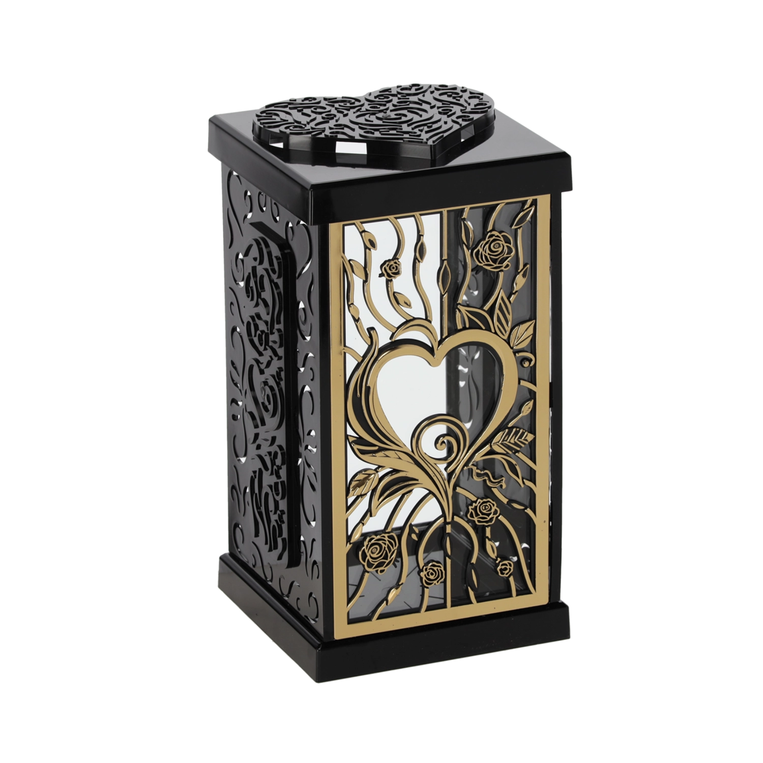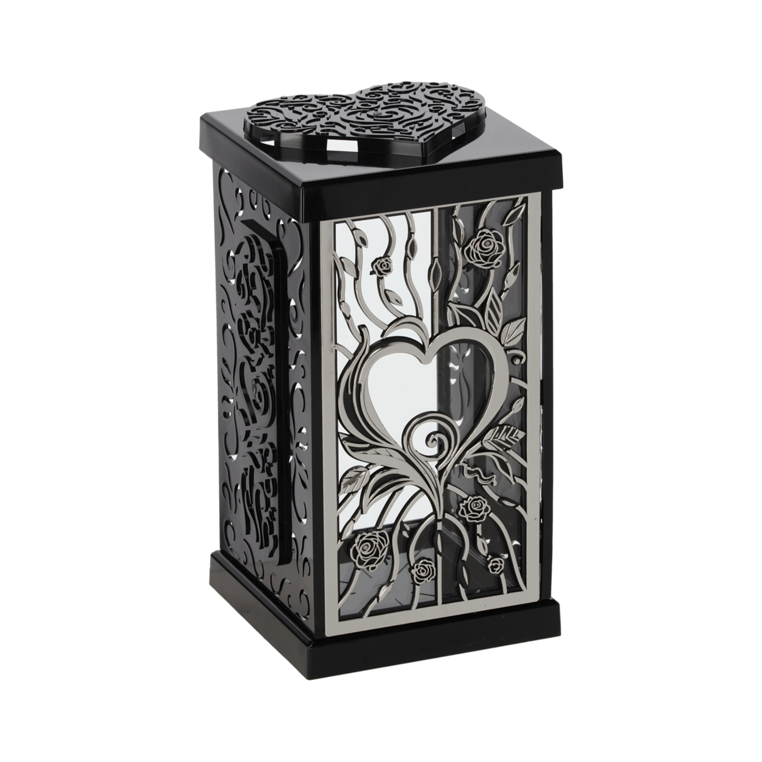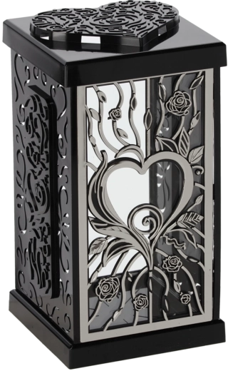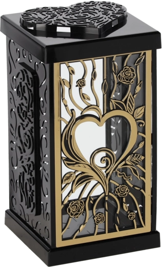 Ovaj stilski lampion s motivom velike ruže unosi u mjesto sjećanja dostojanstvenu i elegantnu atmosferu. Zahvaljujući bezvremenskom dizajnu u crno‑srebrnom ili crno‑zlatnom tonu lijepo se slaže s različitim tipovima nadgrobnih spomenika i dekoracija.
