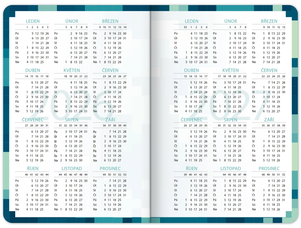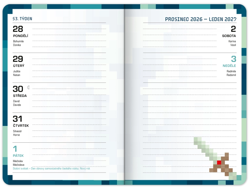 Stilizan školski planer s motivom građevinske videoigre za preglednu školsku godinu od rujna 2026. do prosinca 2027. Nudi praktične podsjetnike iz hrvatskog, matematike i engleskog, rasporede sati i pregled školskih praznika u kompaktnom formatu 9,8 × 14,5 cm – idealno za ruksak ili torbu.