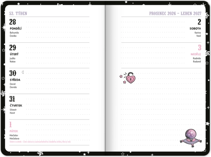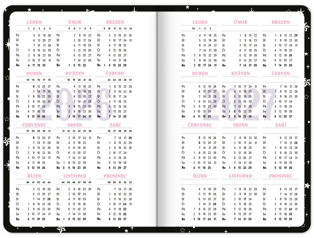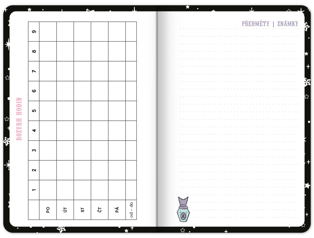 Stilski studentski planer s motivom KUROMI za školarce i studente za razdoblje rujan 2026 – prosinac 2027. Nudi praktične šalabahtere iz matematike, fizike, kemije i engleskog, pregled rasporeda sati i termina praznika. Kompaktna dimenzija 9,8 × 14,5 cm stane u svaki ruksak i torbicu.